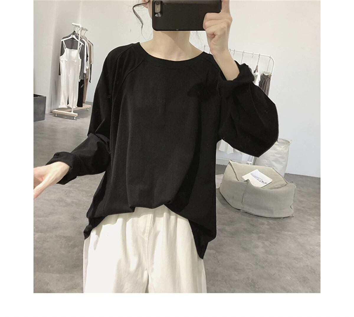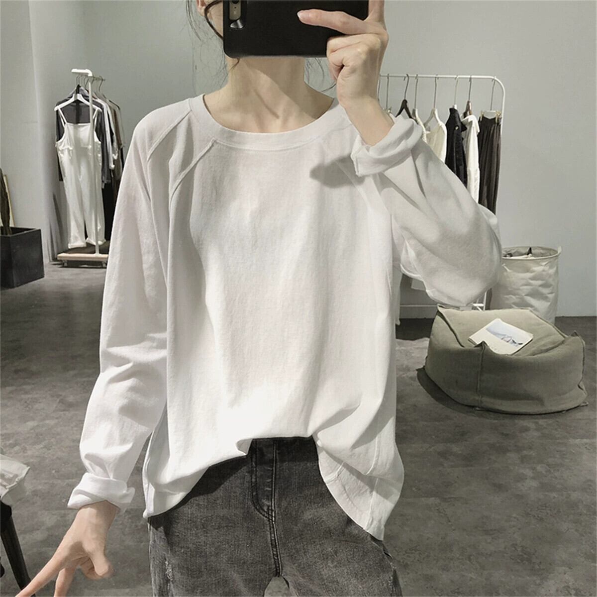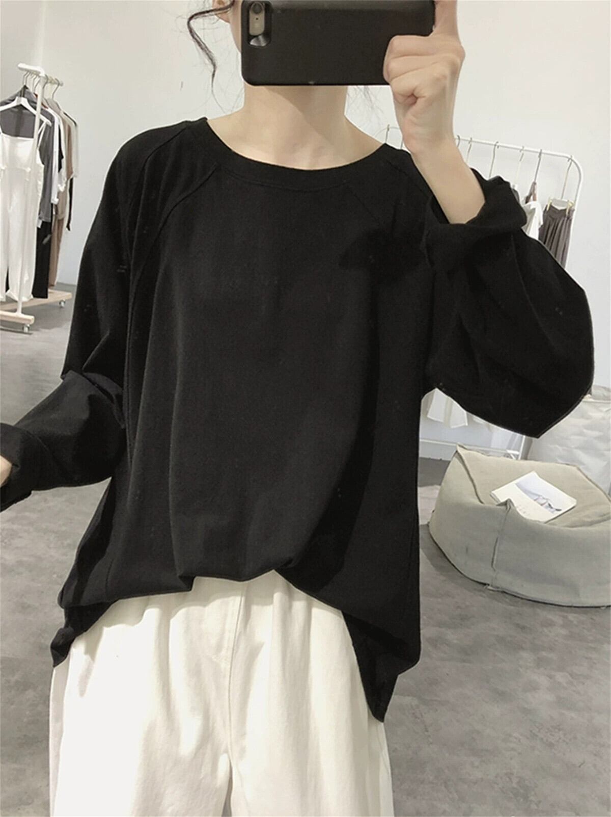 ラグランスリーブTシャツレディース春秋新作ゆったり薄手長袖無地ラウンドカラー年齢軽減シンプル学生綿トップス ロング コットン スプリング 春物 オータム 秋物 ソリッドカラー cat843185408009