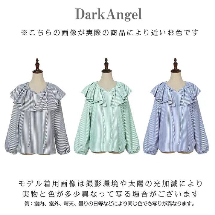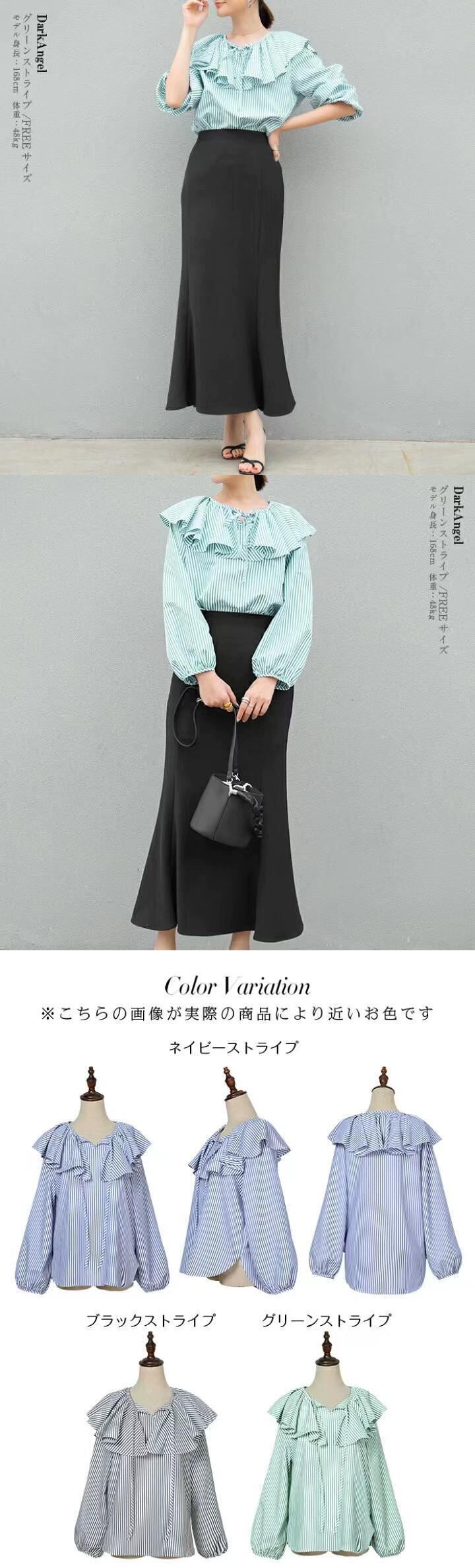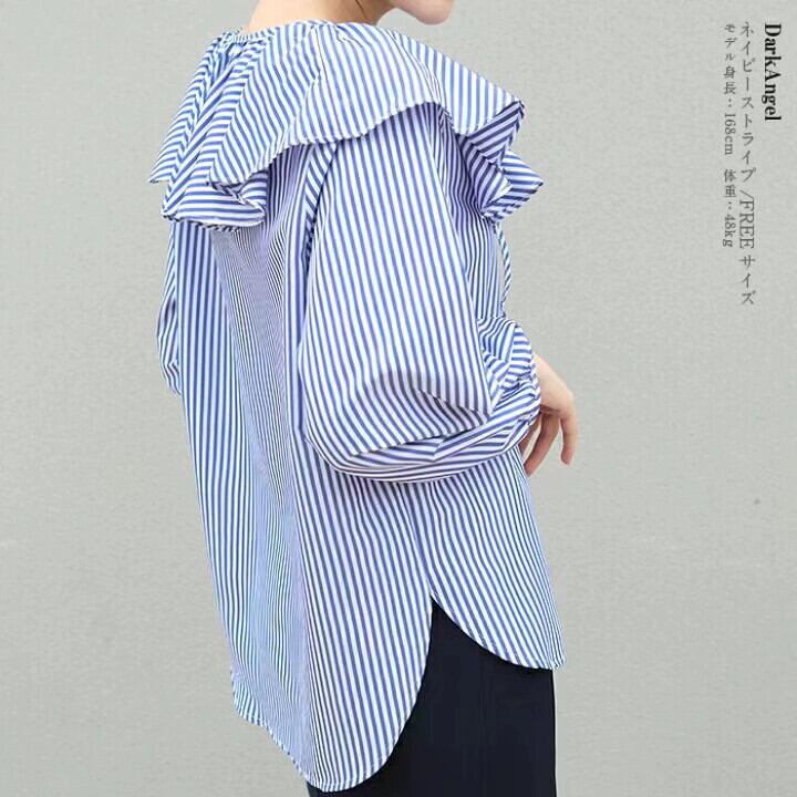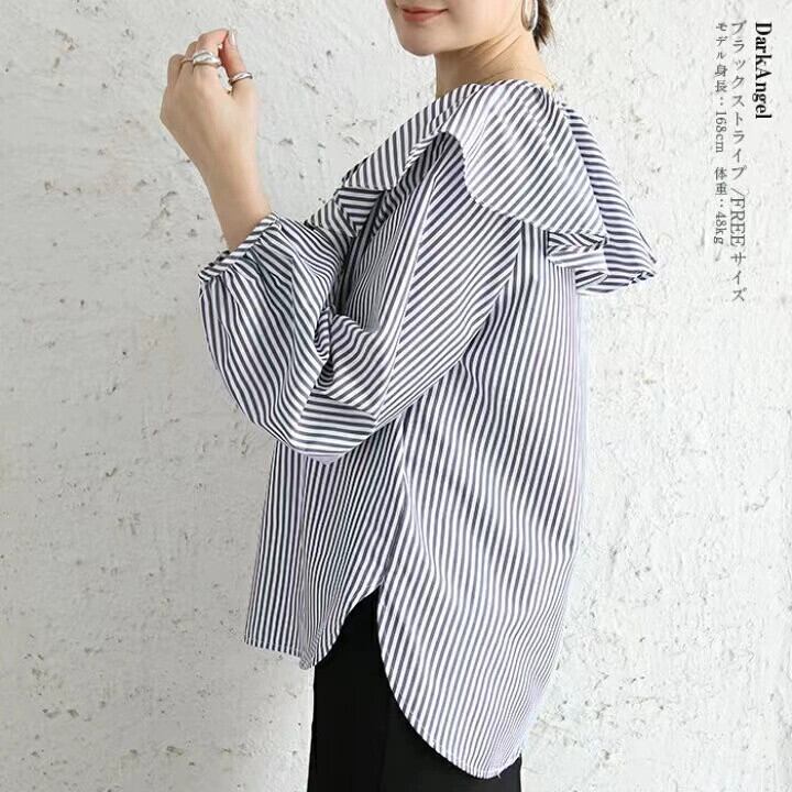 越境貿易春と秋の新作甘くて老化を軽減するルーズ蓮の葉の襟長袖オールマッチストライプシャツレディーストップス ロング 大人ガーリー スウィート キュート カジュアル スプリング 春物 オータム 秋物 cat87370061343