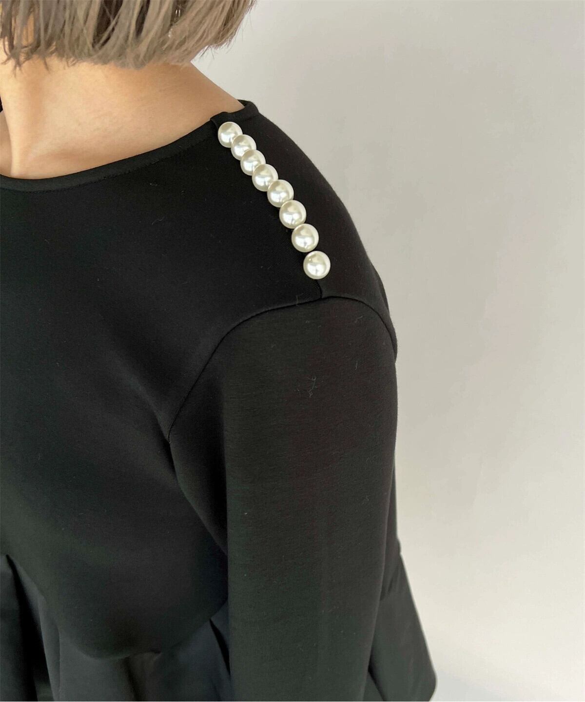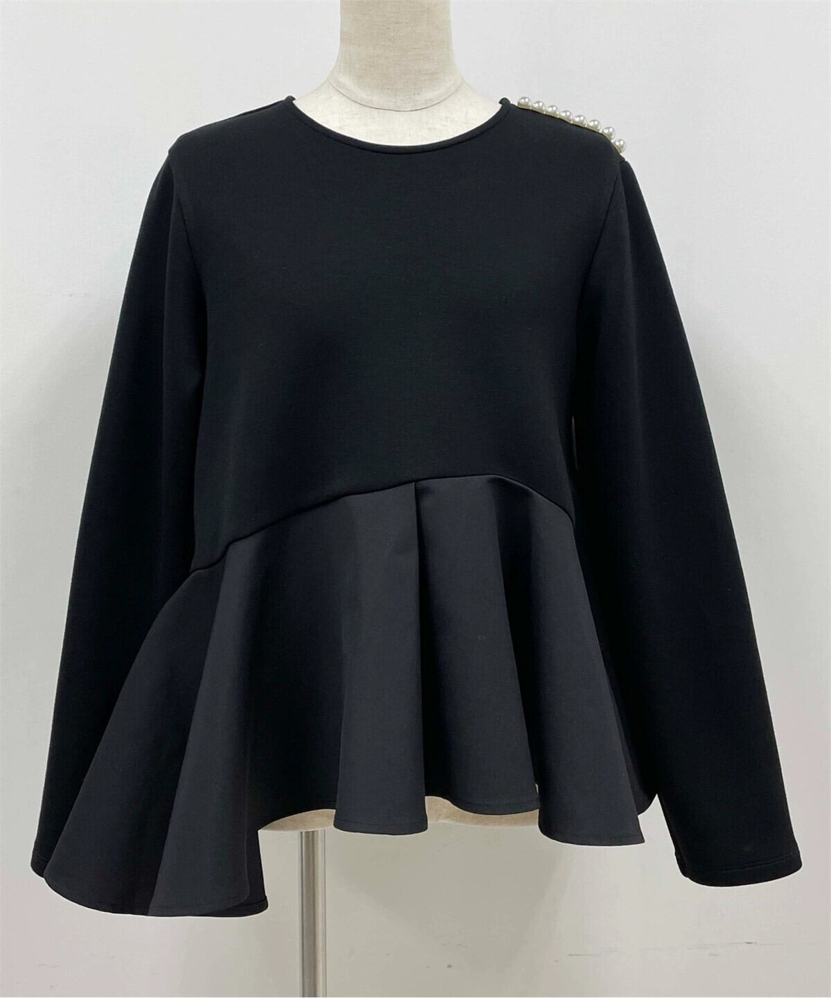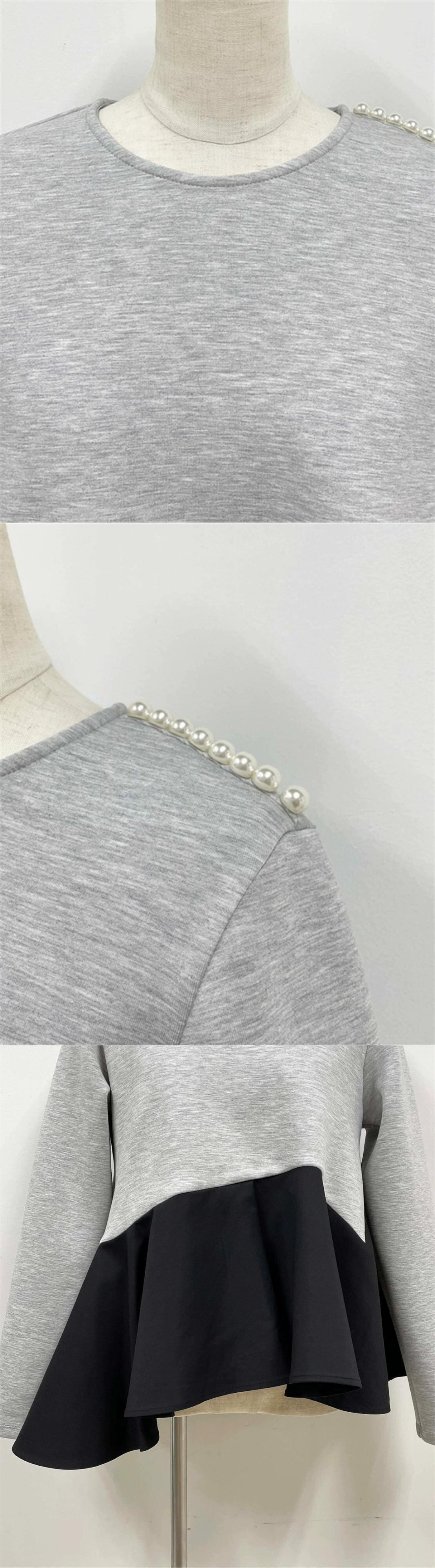 クロスボーダー ese 新しいスタイル初秋デザインセンス裾スプライシング無地ラウンドネックオールマッチパール長袖ボトムストップ女性 ロング オータム 秋物 Oネック 真珠 ソリッドカラー cat846423035179