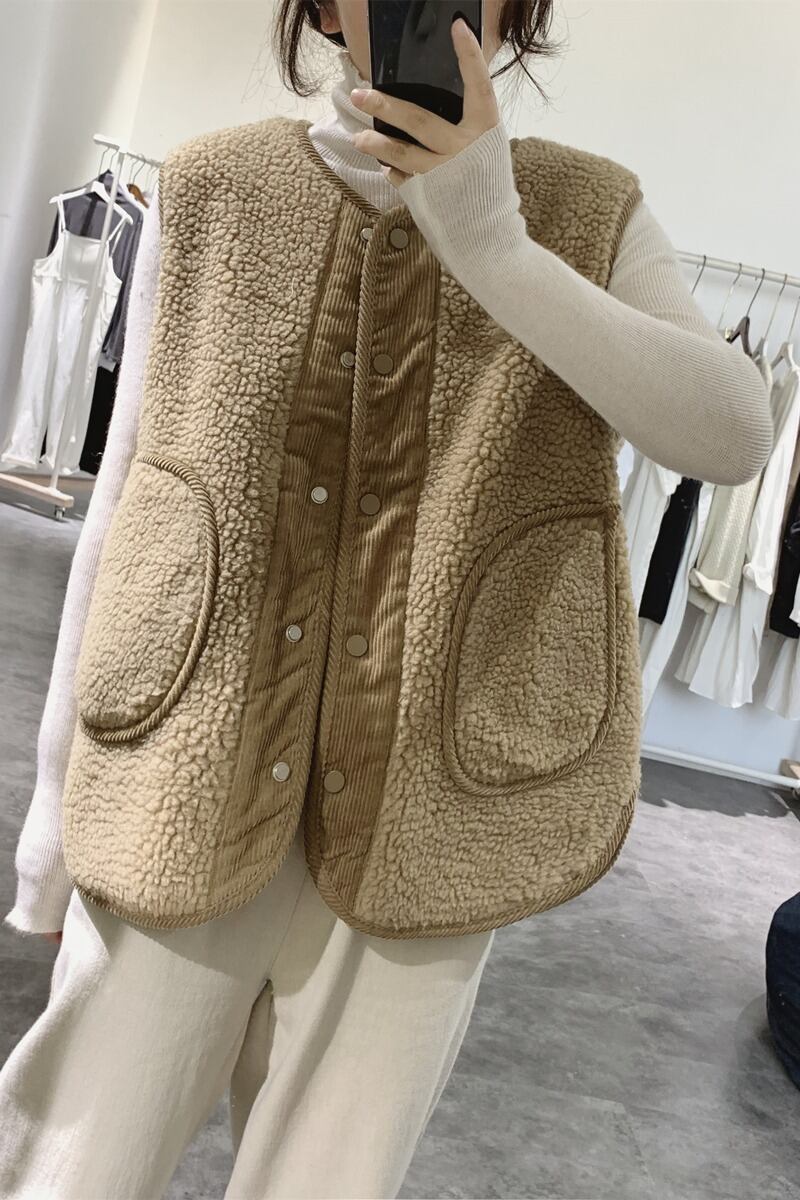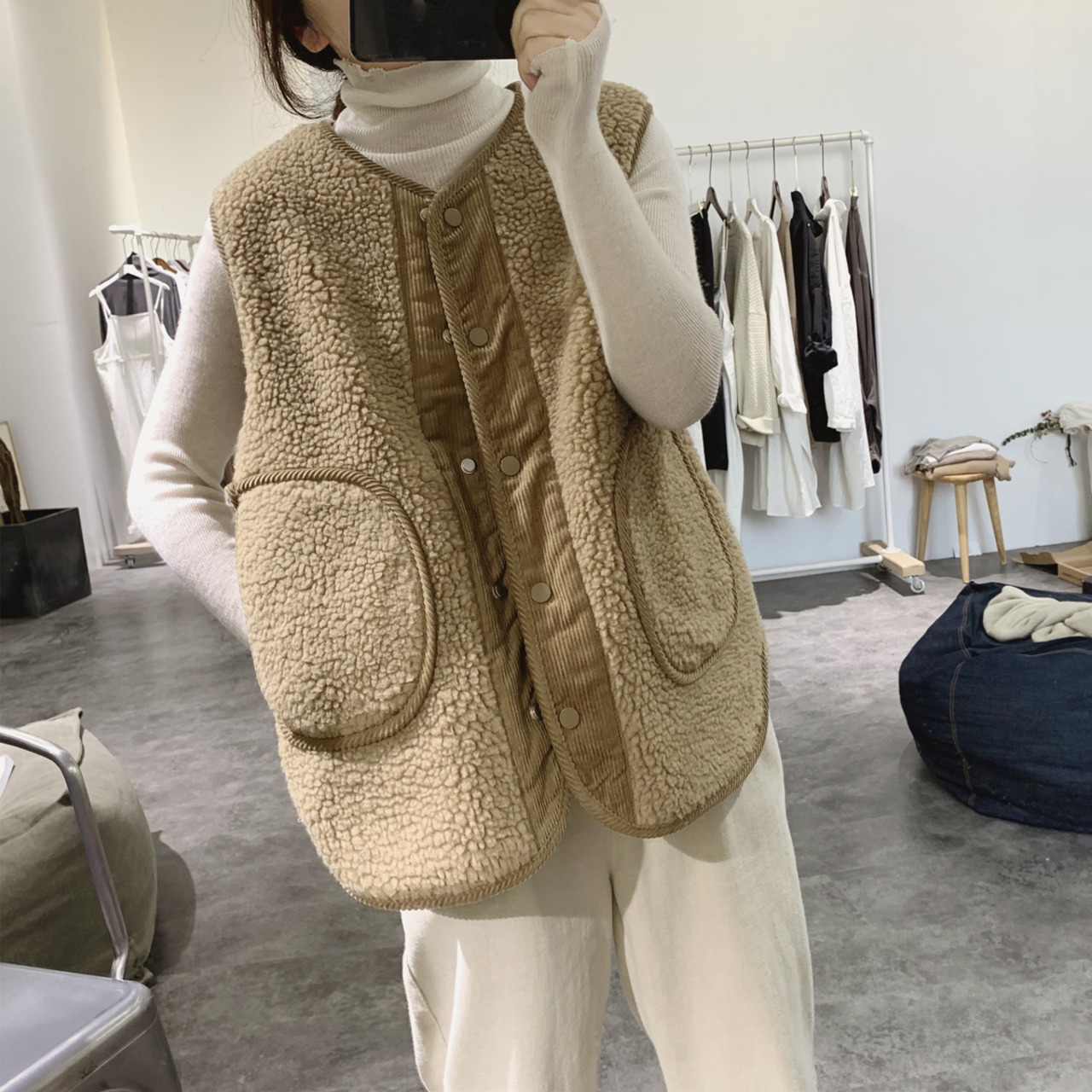 子羊ウールベストジャケット女性の秋と冬の新しいスタイルのポケットレトロルーズで薄い両面コーデュロイツーリングベスト オータム 秋物 ウィンター 冬物 cat876595053693