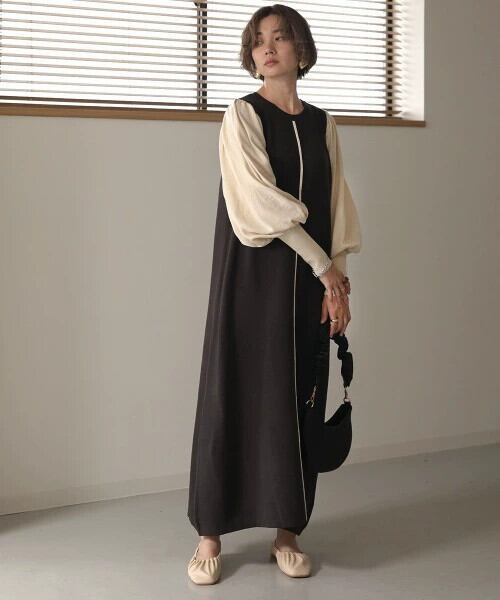クロスボーダー アマゾン シース レディース レトロ ルーズ パフ スリーブ 長袖 ラウンドネック カラーマッチング ニット ロングドレス トレンディ Oネック cat82627346564