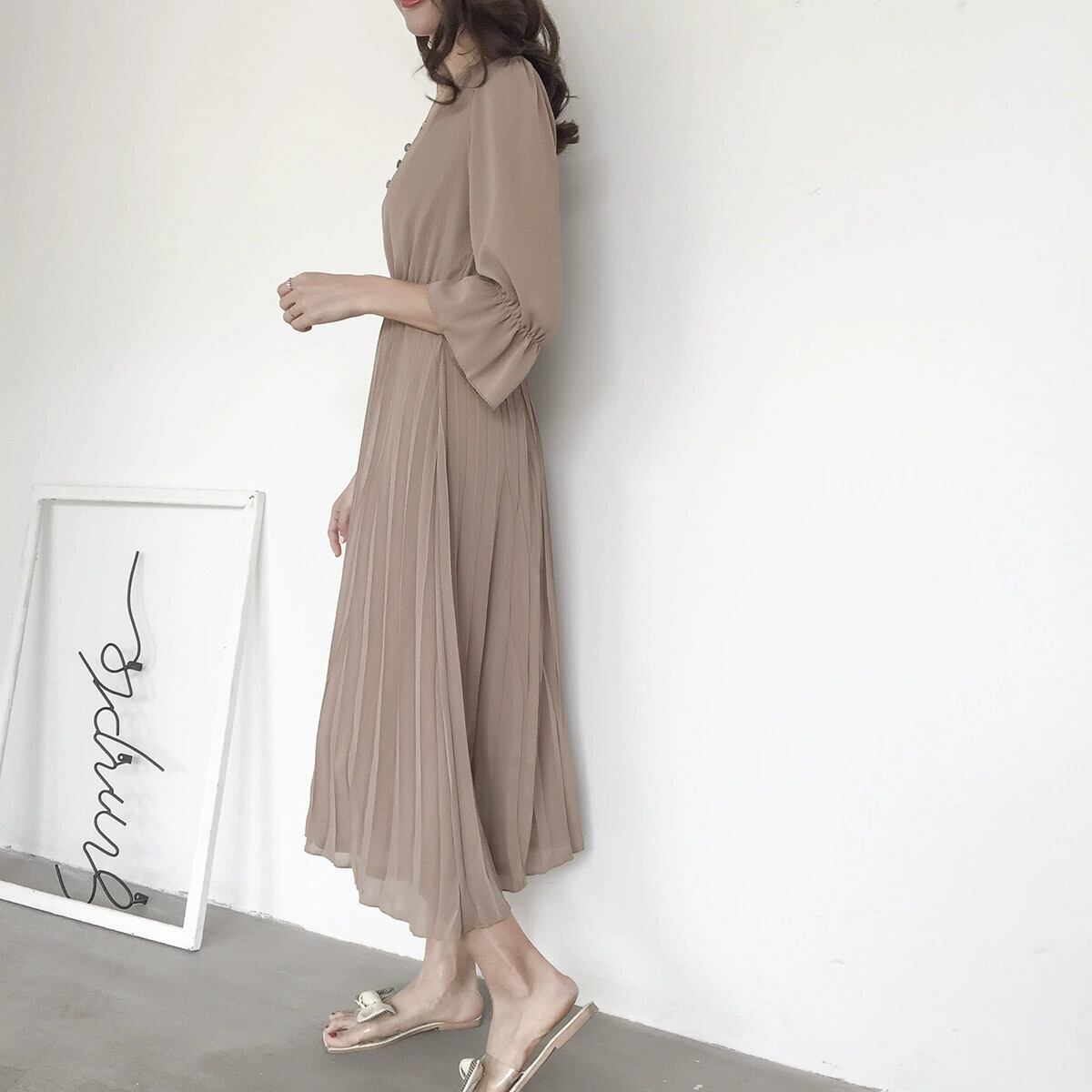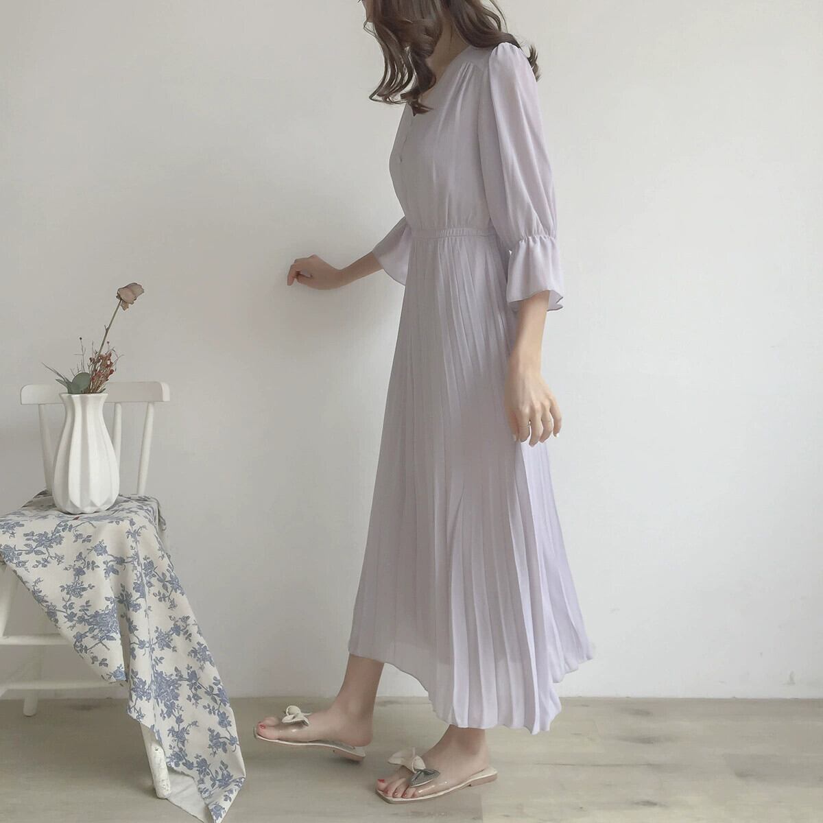 越境夏新スタイル痩身シフォントランペットスリーブプリーツロング膝上Vネックドレス サマー 夏物 cat822024769974