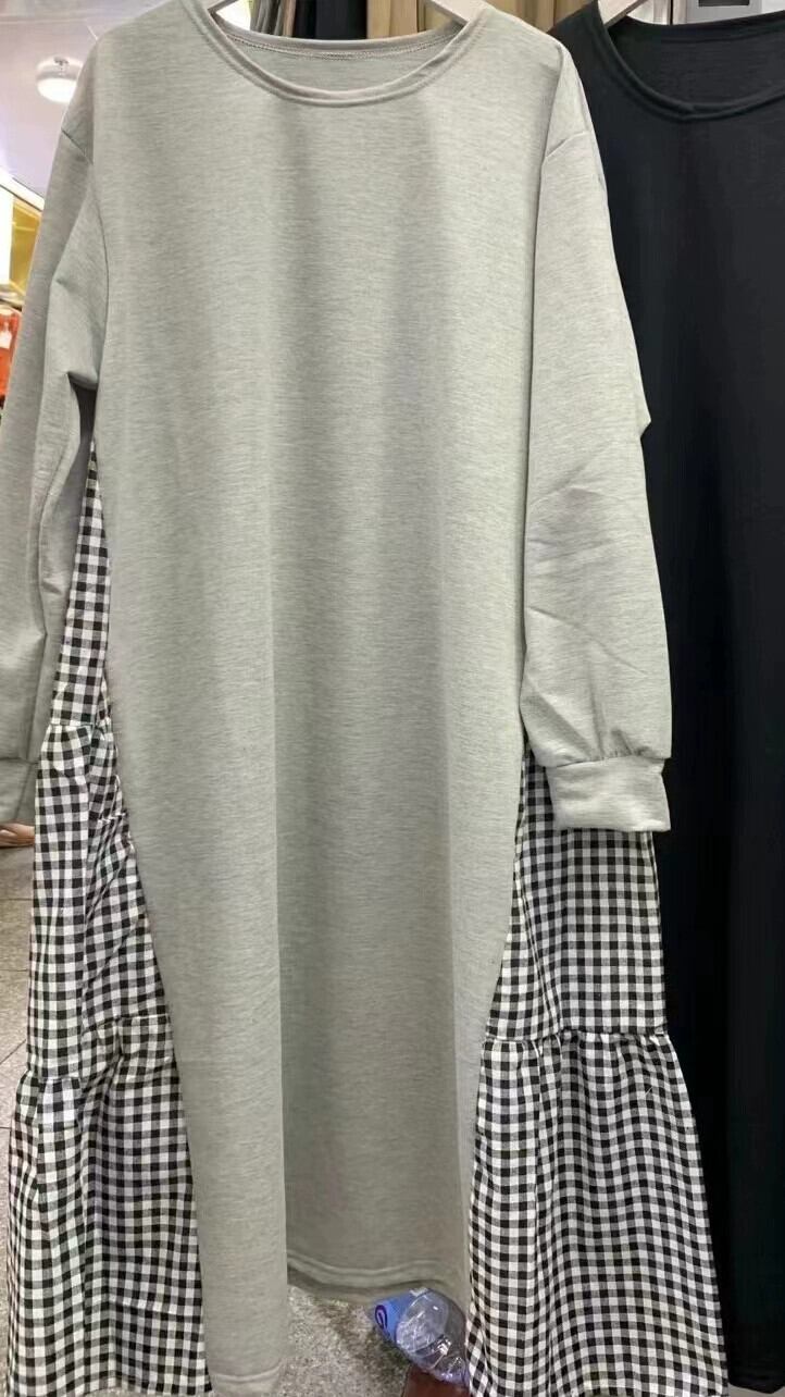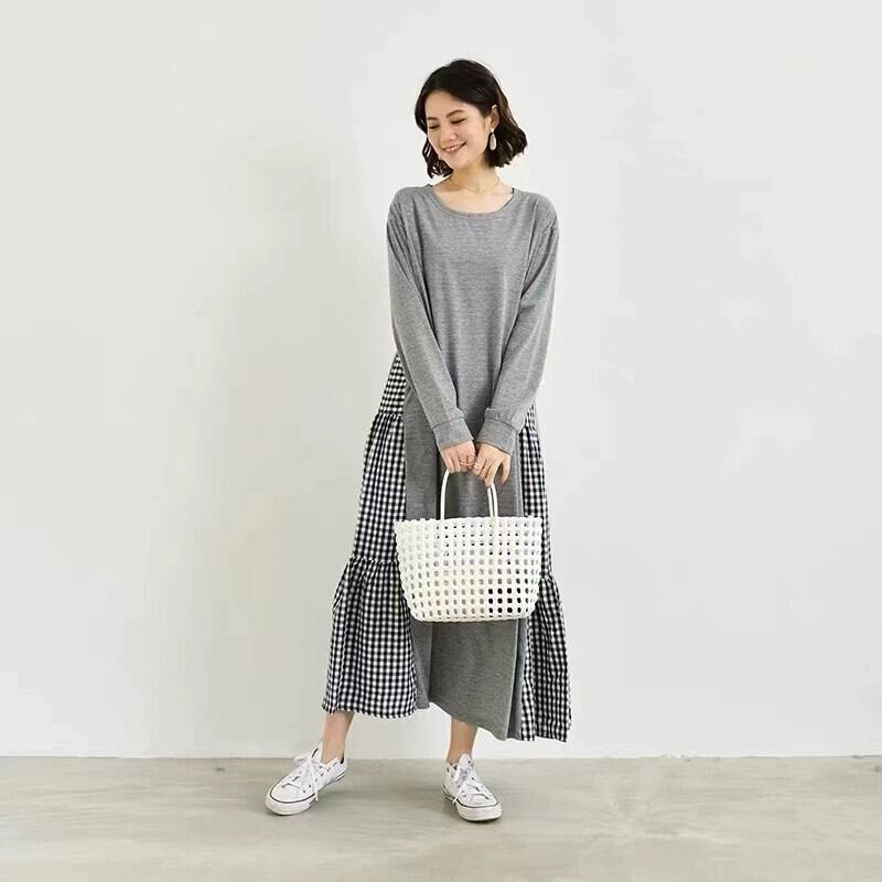 クロスボーダー ese と秋の新しいラウンドネック長袖ルーズ大きいサイズ文学チェック柄ステッチロング膝丈ドレス女性 大きめサイズ オータム 秋物 Oネック cat885279444943