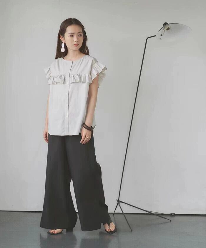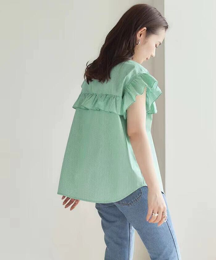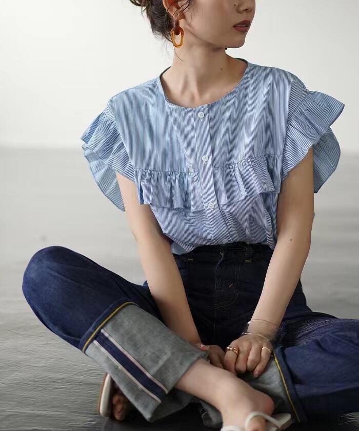 クロスボーダー ese と夏の新しいラウンドネックフライングスリーブフリルトップシングルブレストレースシャツストライプ小さなシャツ女性 サマー 夏物 Oネック cat818388173237