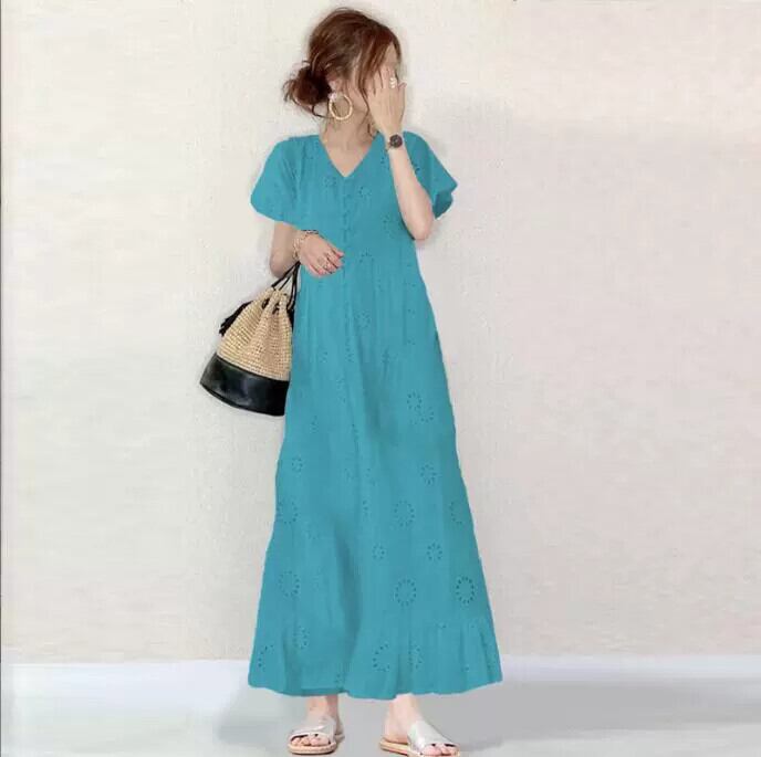 クロスボーダー 2023 夏レトロ V ネックルーズ半袖膝丈黒ハイウエストレース A ラインドレス ブラック サマー 夏物 Vネック Aライン cat837115269604