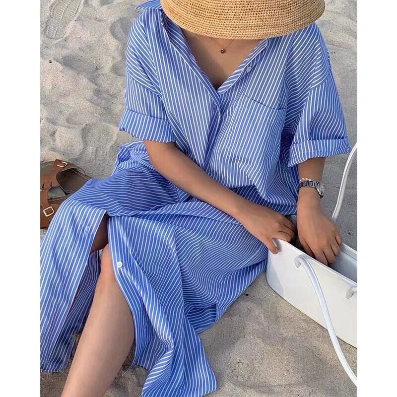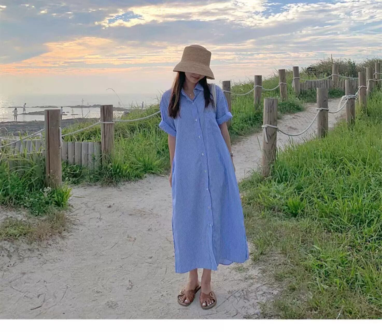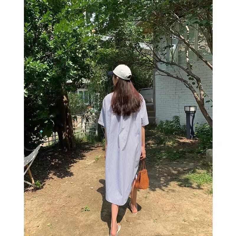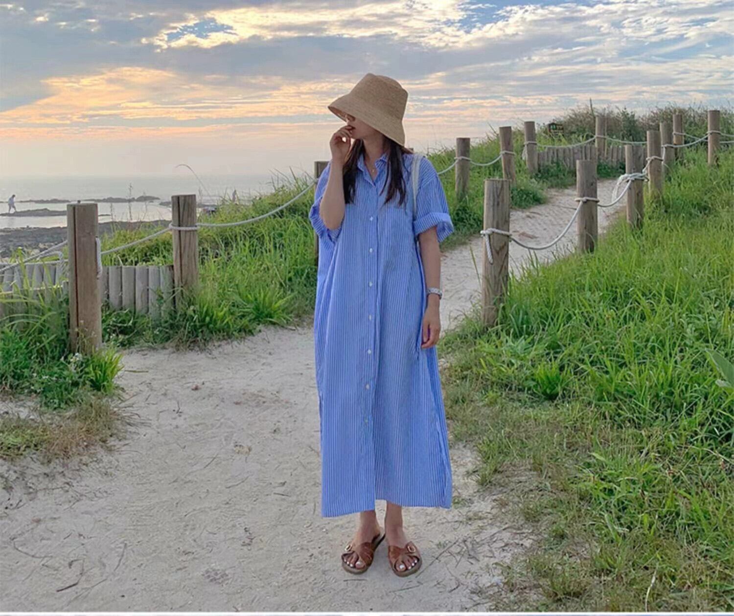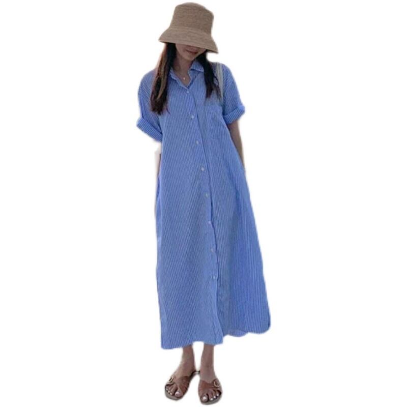 バージョンの緩い大きいサイズのストライプ膝スカート 2022 夏の新しい気質ニッチデザイン通勤シャツドレス 大きめサイズ サマー 夏物 cat8686556982