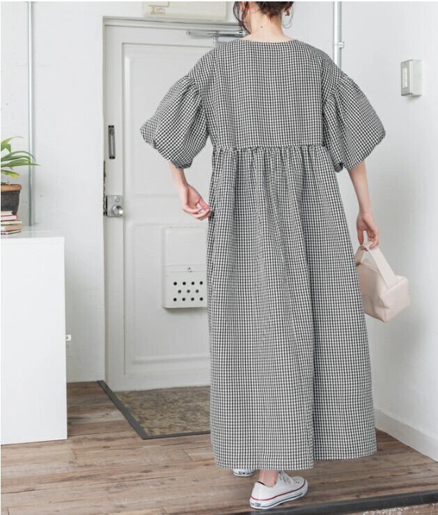 2023 新作 ese とチェック柄 A ライン シャツドレス V ネック パフ スリーブ Vネック Aライン cat852766497428