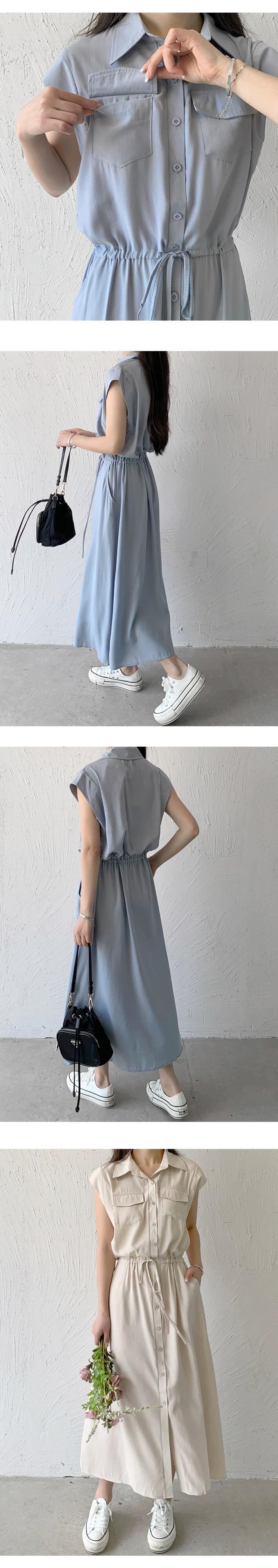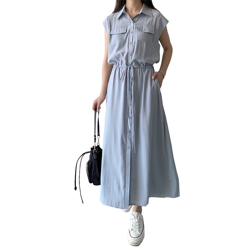 eign trade と南夏の新しいルーズノースリーブポケットミッドレングスドローストリングウエストカジュアルラペルシャツドレス サマー 夏物 cat814276333168