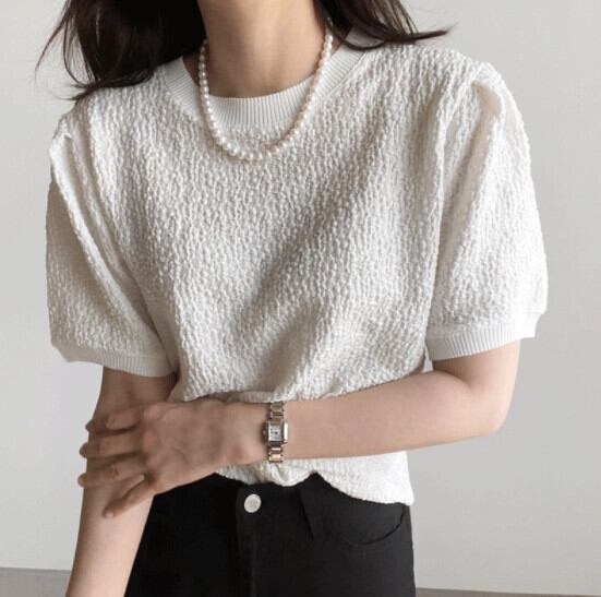 プリーツラウンドネックカジュアルTシャツレディース夏新作ゆったり薄手シンプル半袖コットン気質オールマッチトップ サマー 夏物 Oネック cat840250767823