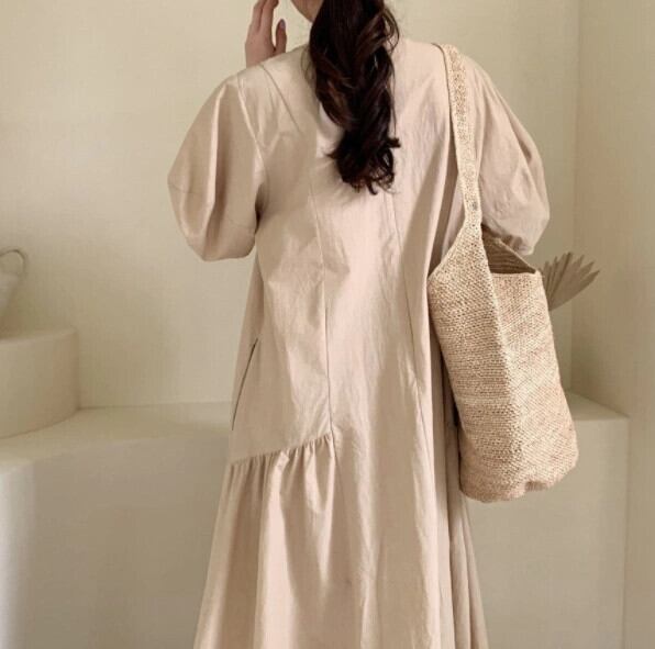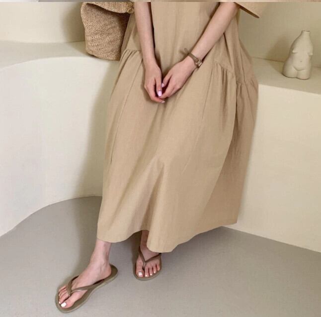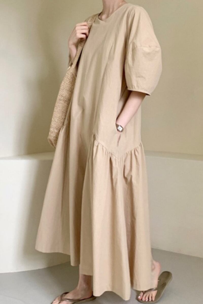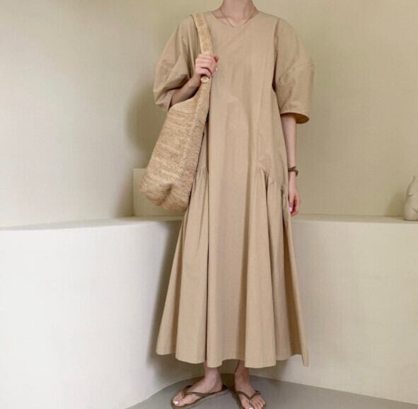 シックな夏シンプルなレトロな不規則なデザインニッチルーズ怠惰なロングスカートラウンドネック半袖ドレス サマー 夏物 Oネック cat897443044141