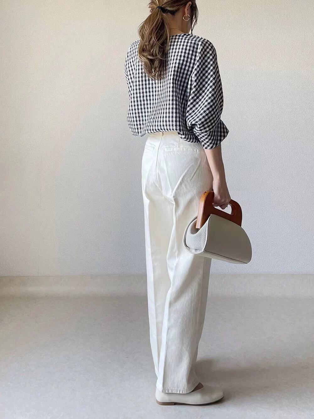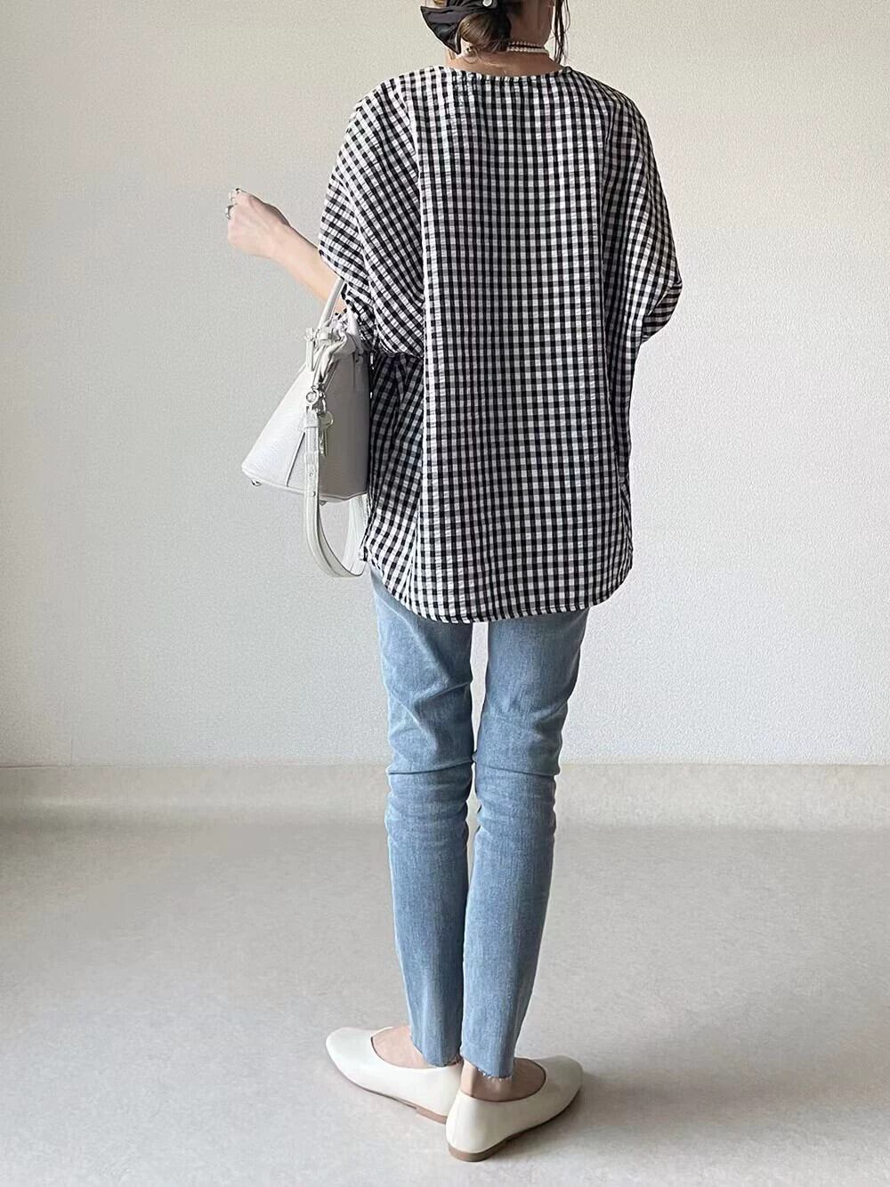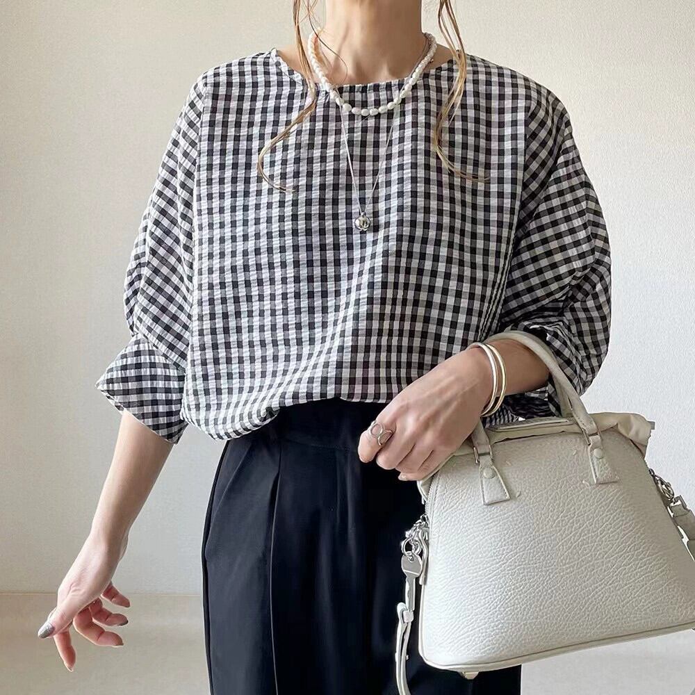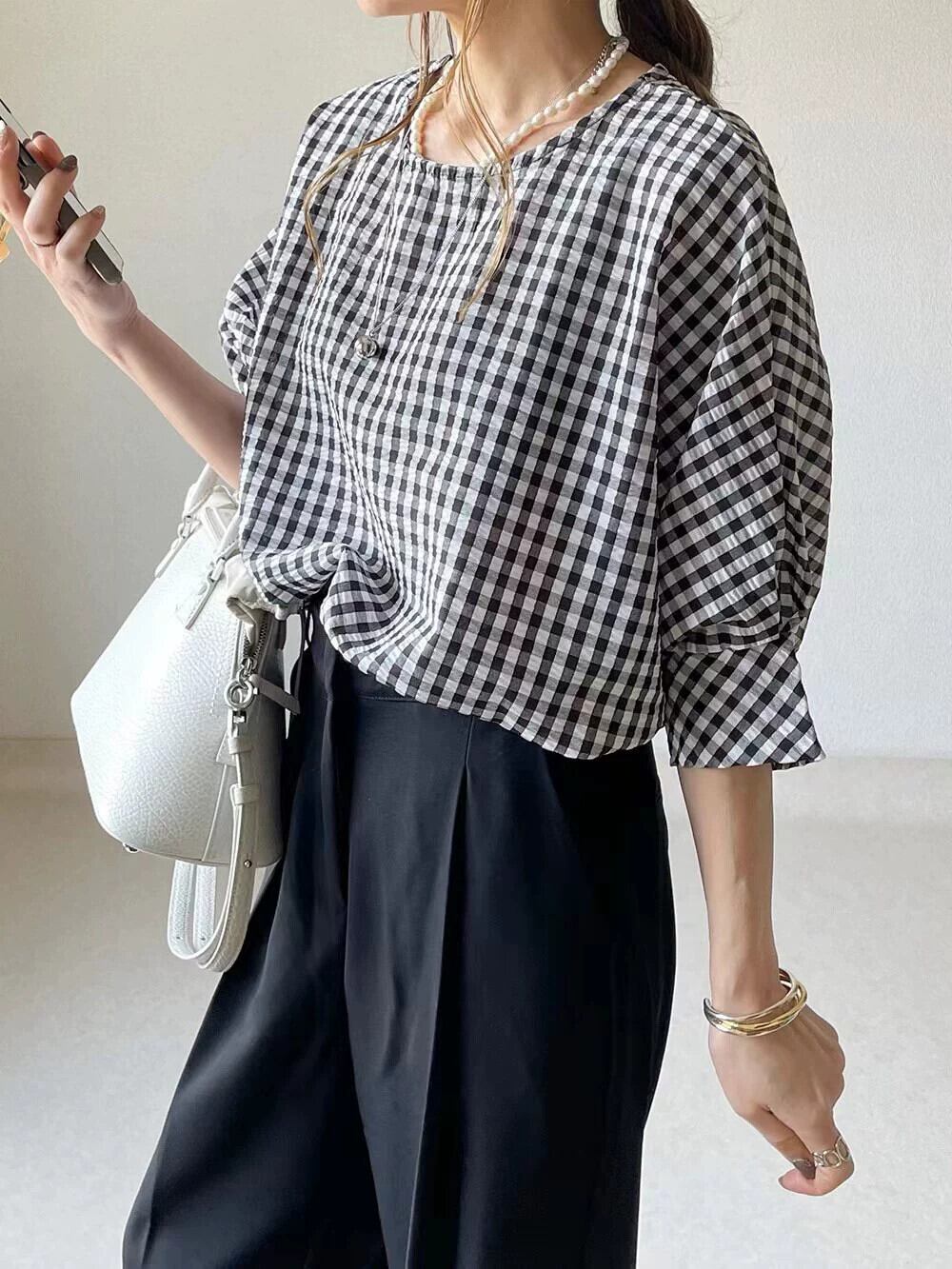2023 ese 夏新婦人服袖口プリーツランタン袖チェック柄ルーズスリムラウンドネックシャツシャツ ランタンスリーブ サマー 夏物 Oネック cat876475355444