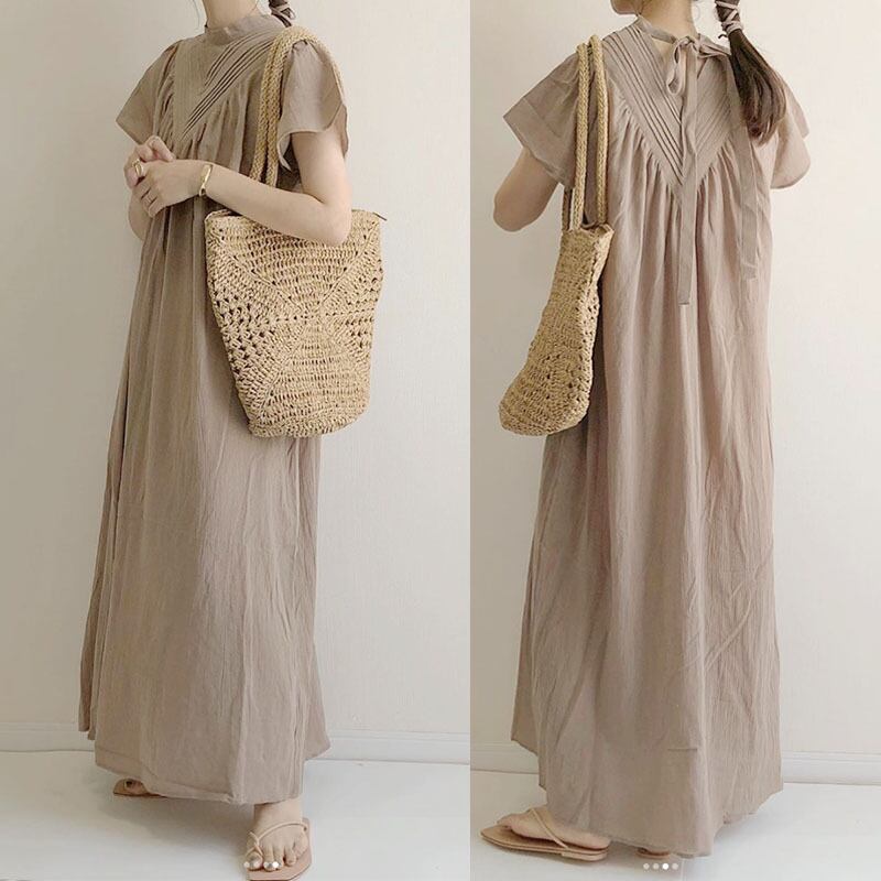 ボヘミアンホリデースタイルアマゾン気質コットンとリネンのソリッドカラードレススタンドアップカラー膝上気質ロングスカート cat826244669732