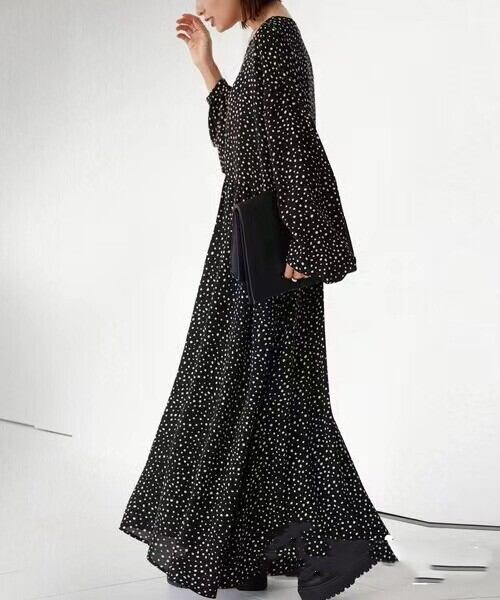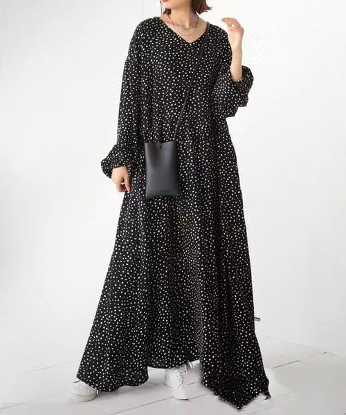越境貿易・南ロッテセール大きいサイズゆったり長袖Vネック不規則ドットプリントロングワンピース 大きめサイズ cat845886764139
