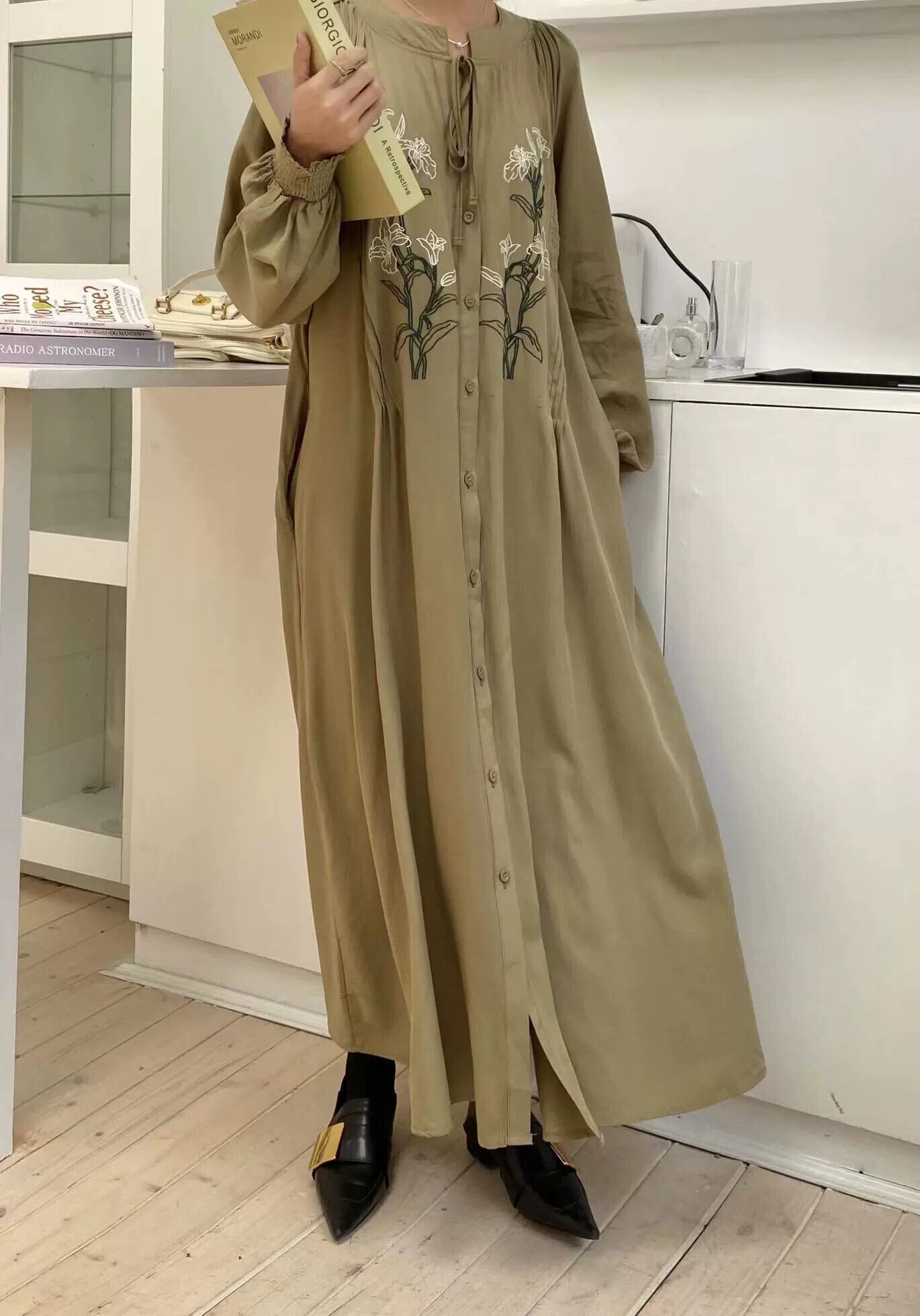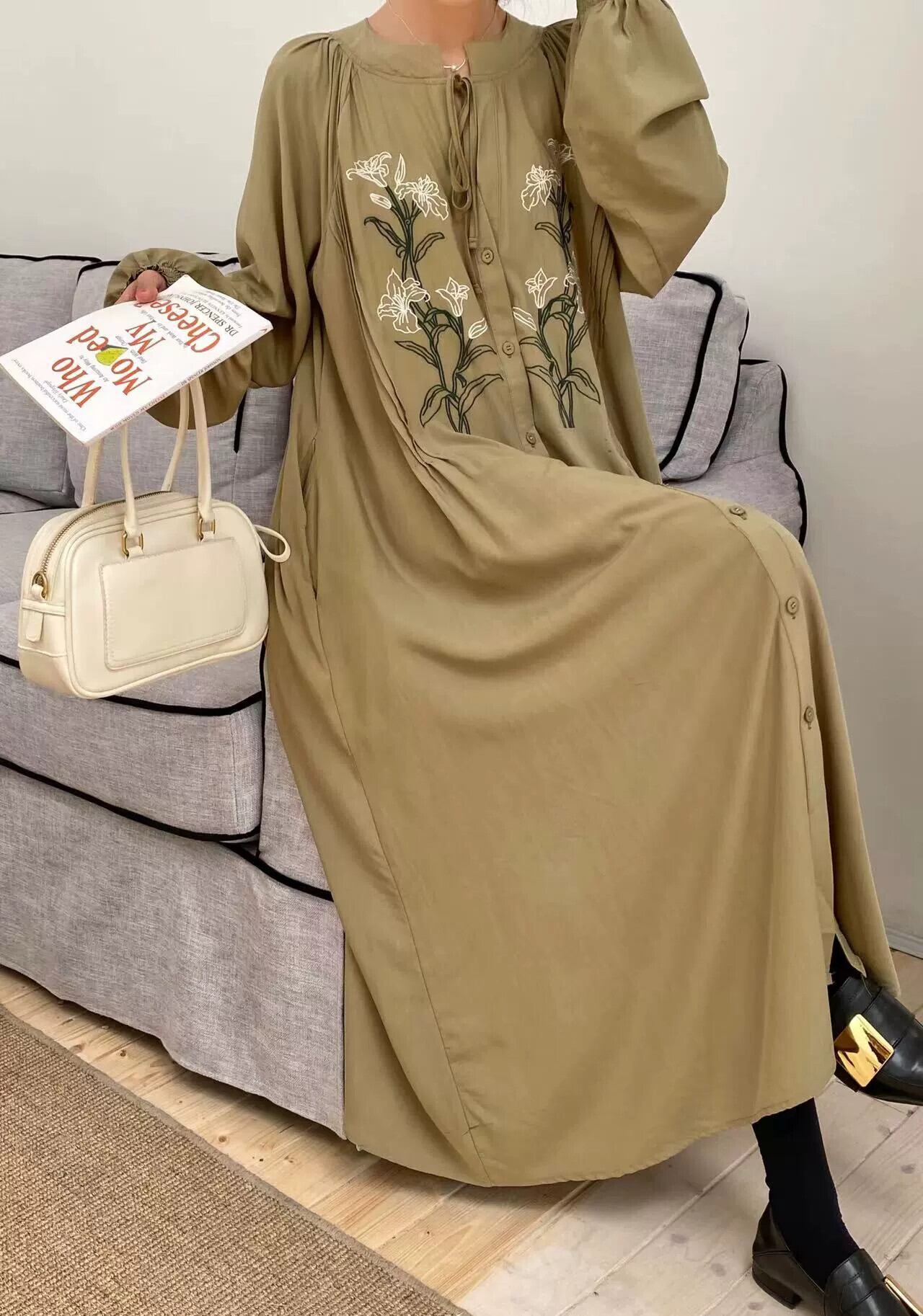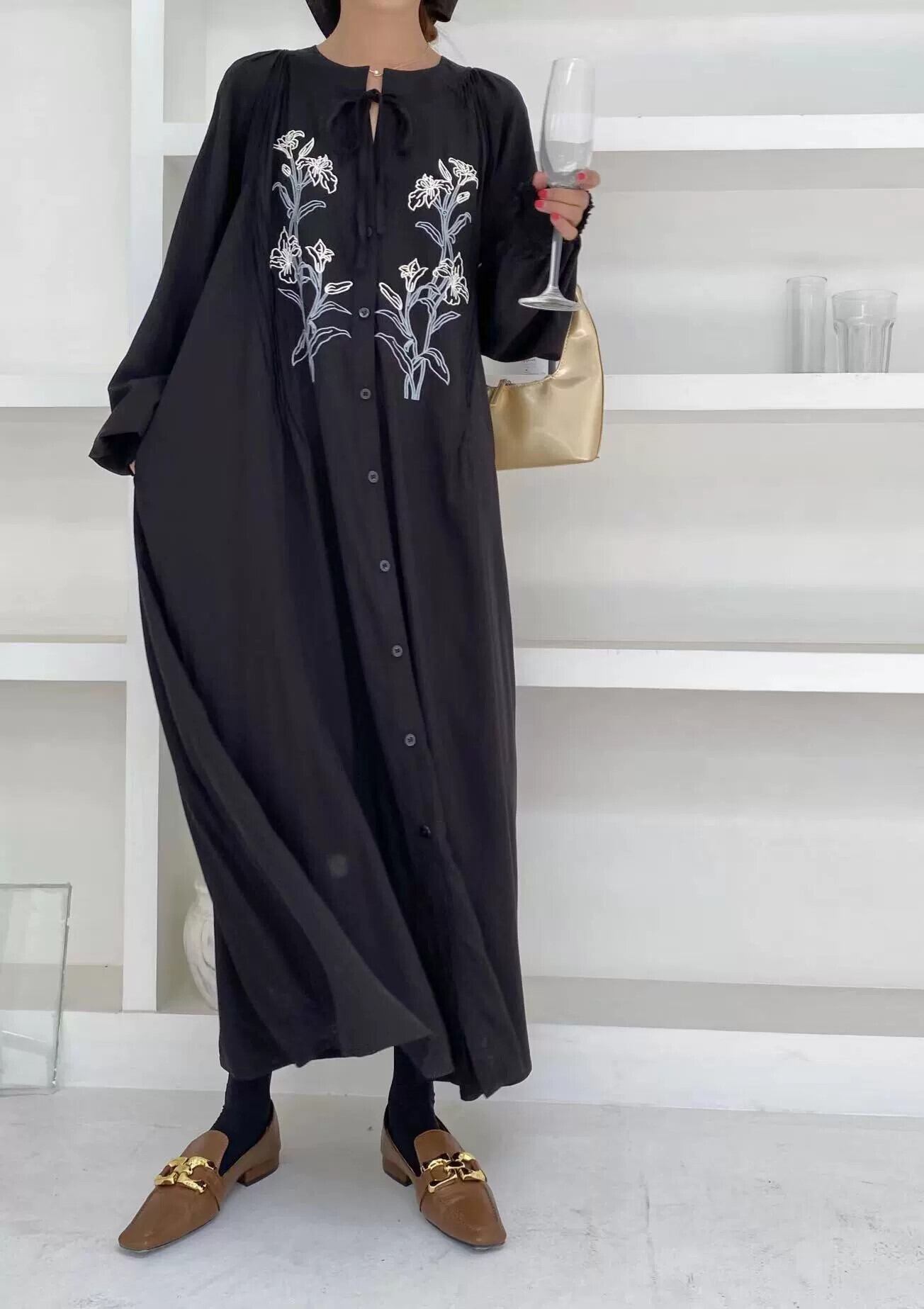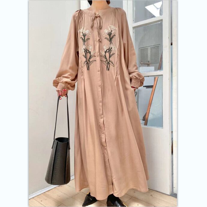 バージョン本物の春と夏のレトロな文学と芸術の刺繍ルーズで薄いシングルブレストのストラップ付き長袖膝丈ロングドレス スプリング 春物 サマー 夏物 cat854640417537