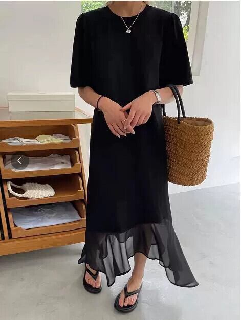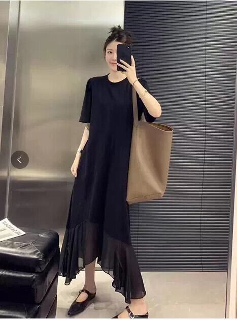 2023 新しい夏のスタイルシンプルな気質ステッチシフォンブラックドレス気質スリムリトルブラックドレス サマー 夏物 cat822269372944