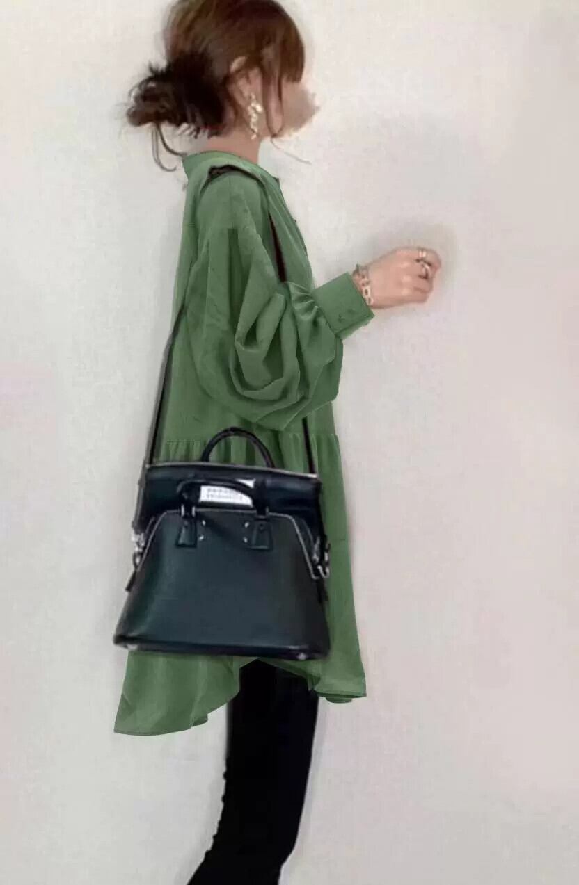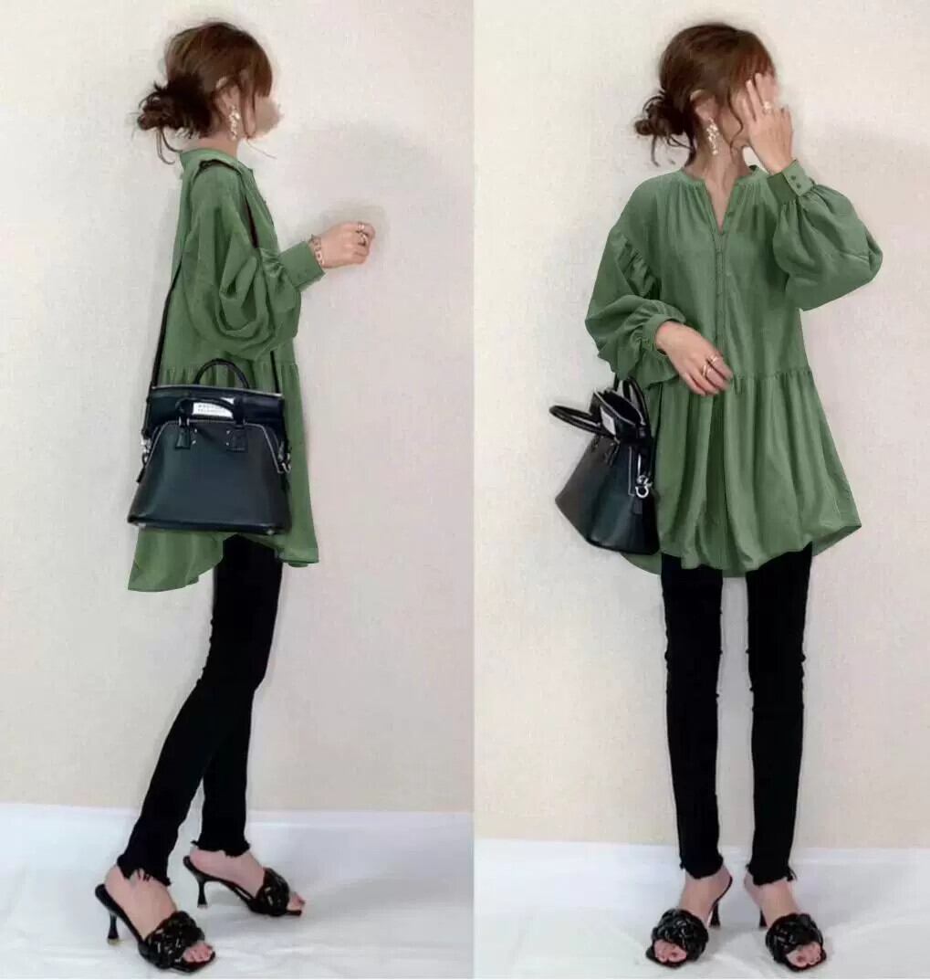 越境アマゾン秋服シンプルな風長袖 V ネックプルオーバールーズシャツ女性ダークグリーンミッドレングストップ ロング オータム 秋物 Vネック cat858570126514