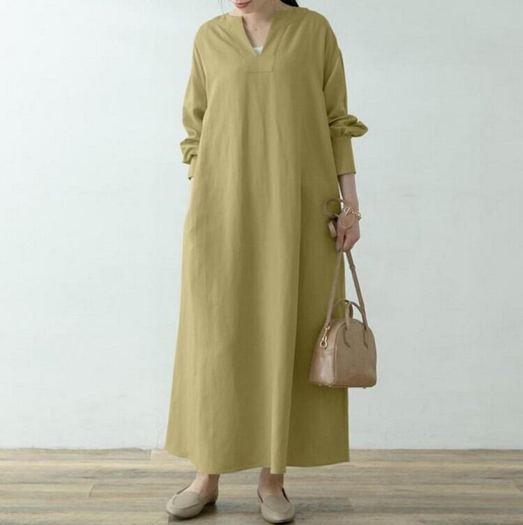 越境 ese eign trade レディース秋新作 V ネック長袖大きいサイズゆったりカジュアルロング膝丈コットンリネンドレス 大きめサイズ オータム 秋物 Vネック cat815036793102