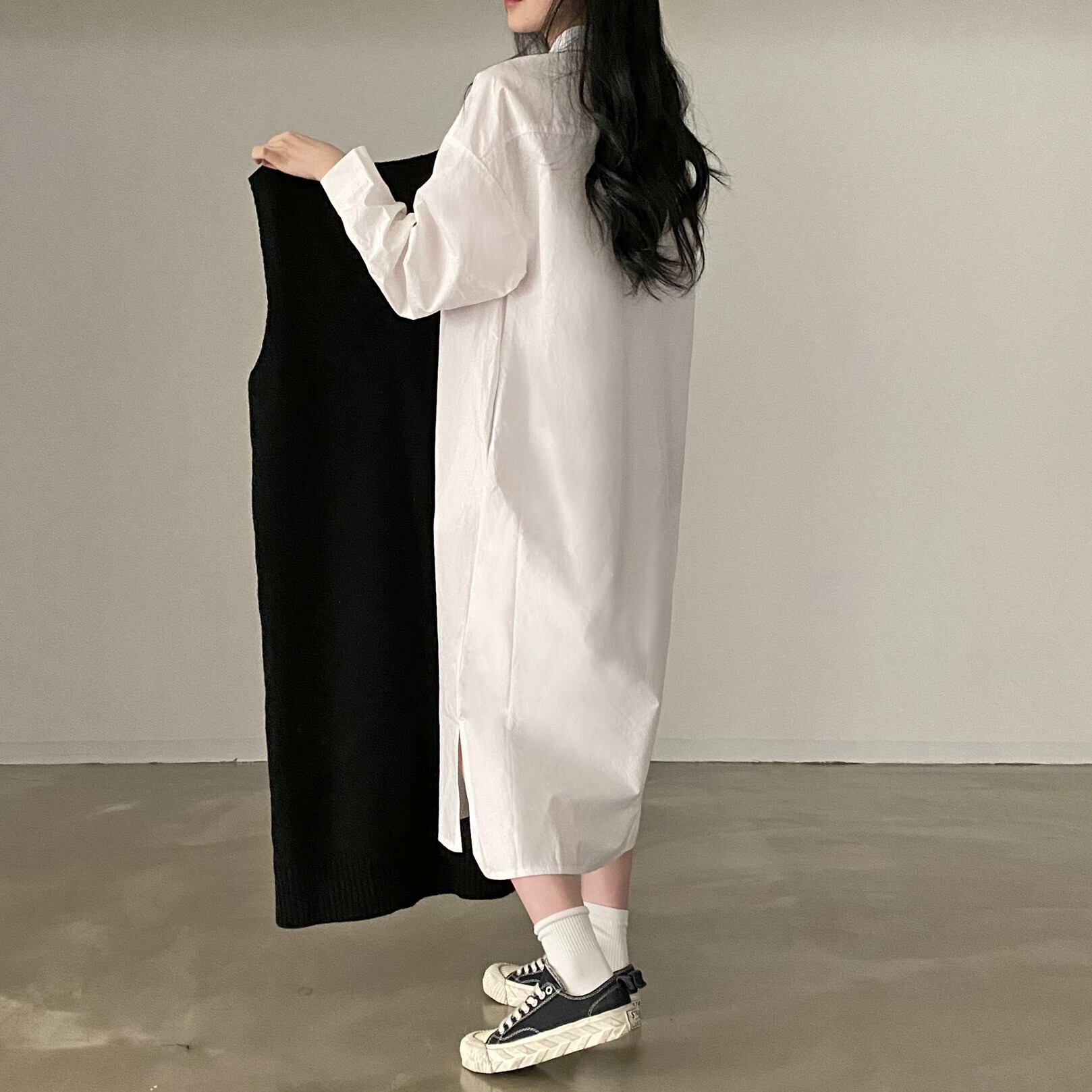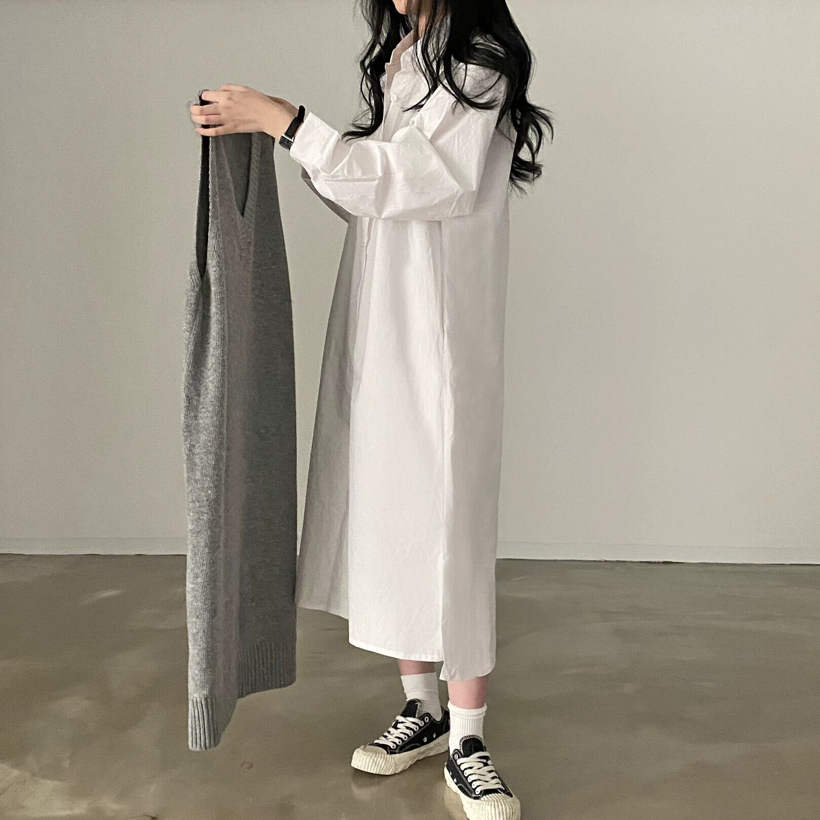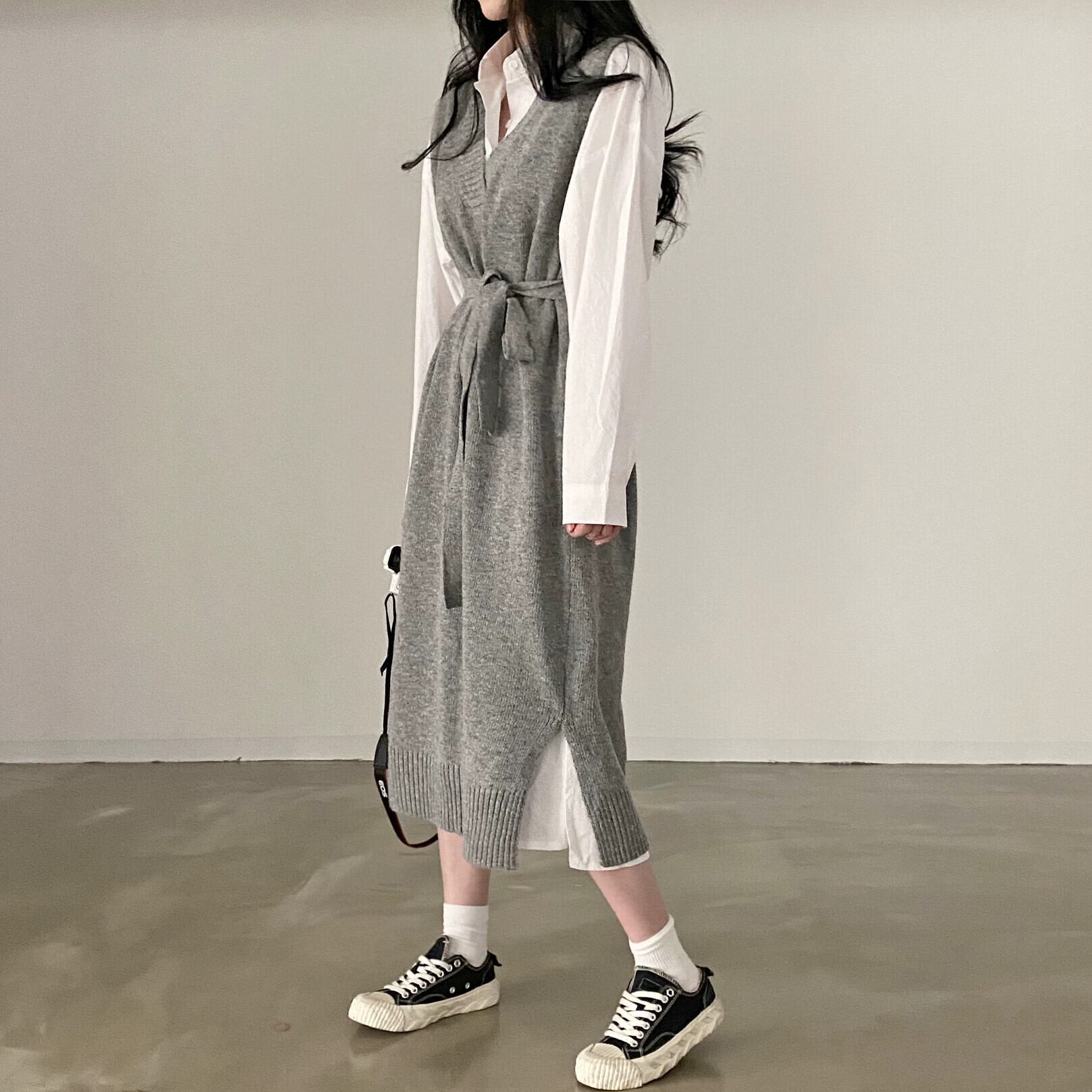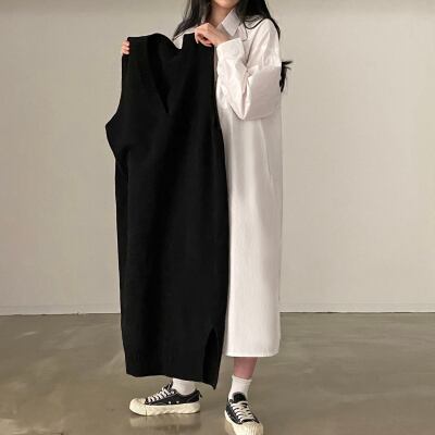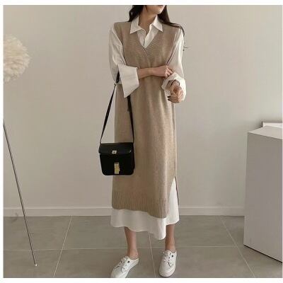 国境を超えたシックなスタイルの秋冬の新しい怠惰なスタイルのノースリーブVネックミッドレングスベストセーター+無地シャツドレス オータム 秋物 ウィンター 冬物 ソリッドカラー cat822930196477