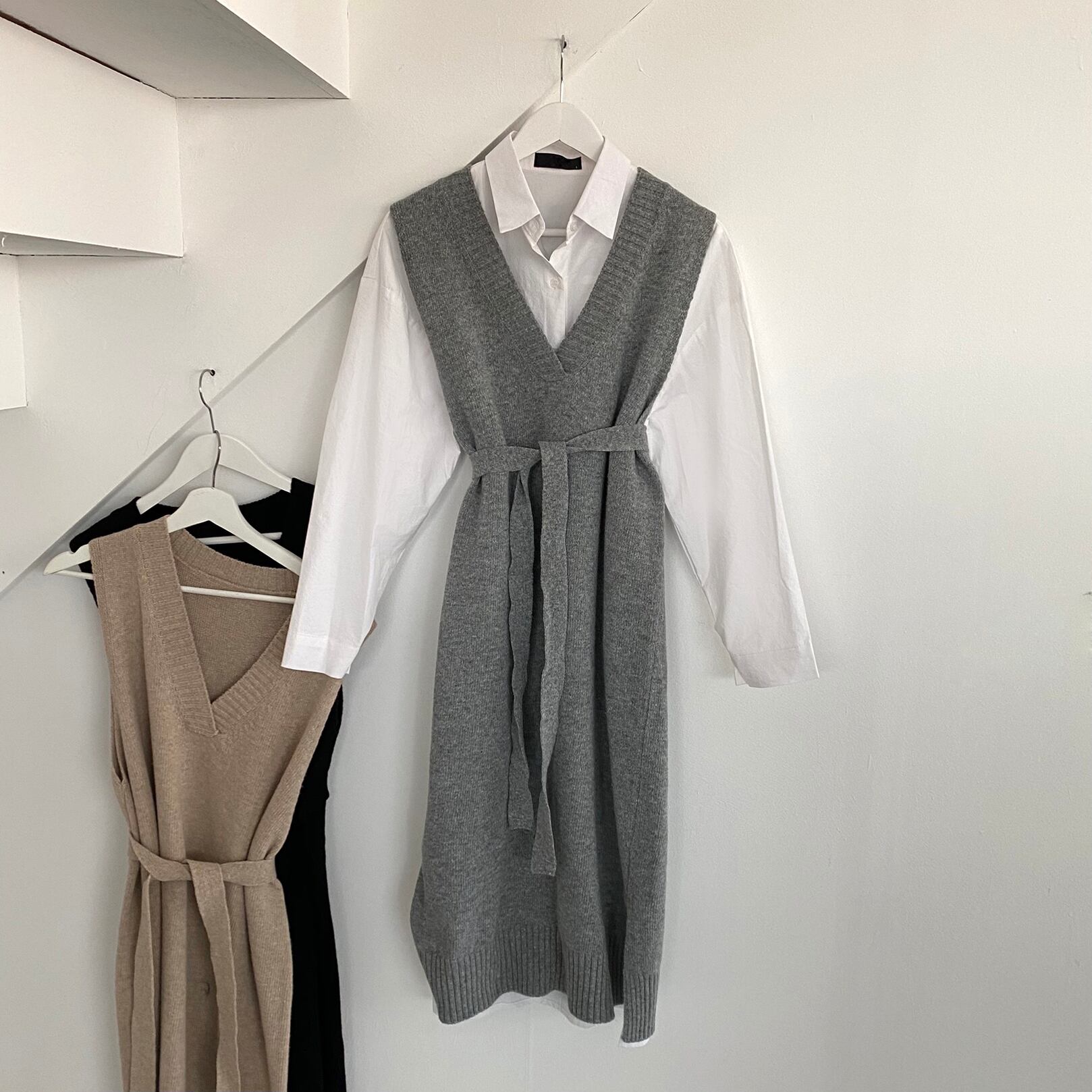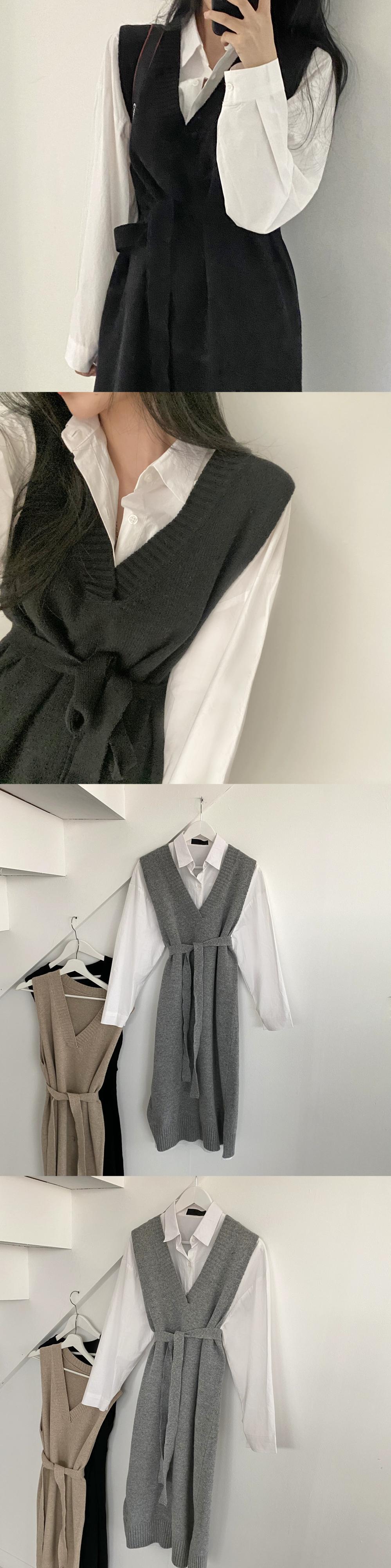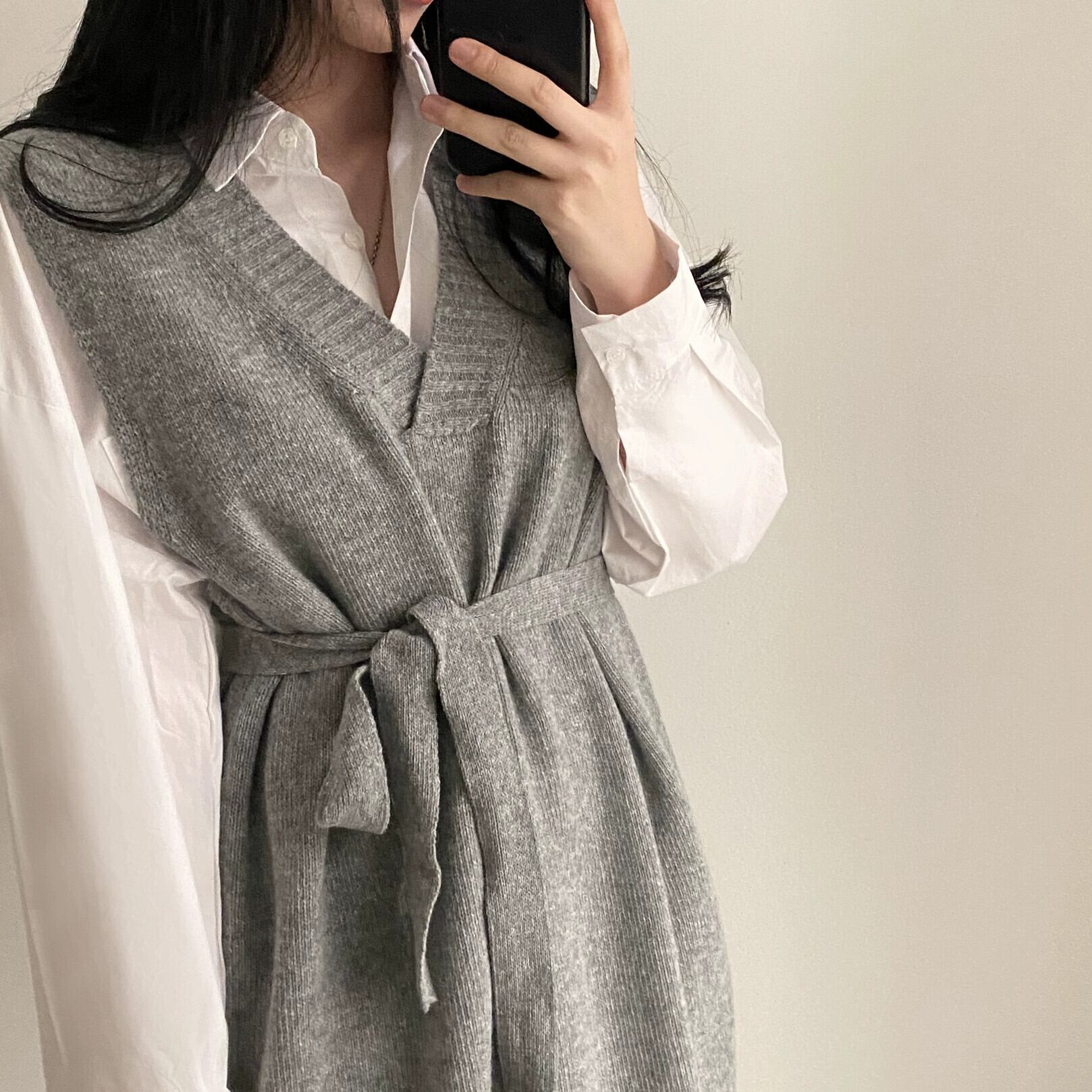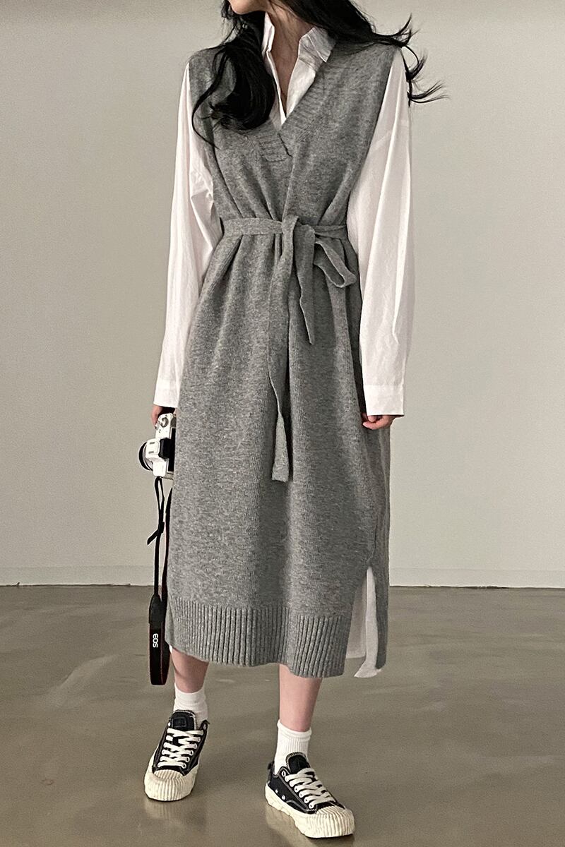 国境を超えたシックなスタイルの秋冬の新しい怠惰なスタイルのノースリーブVネックミッドレングスベストセーター+無地シャツドレス オータム 秋物 ウィンター 冬物 ソリッドカラー cat822930196477