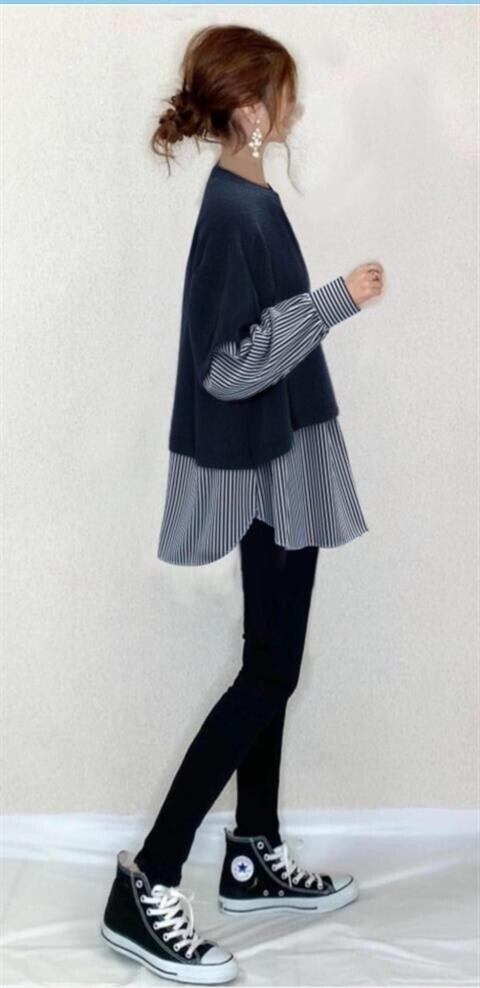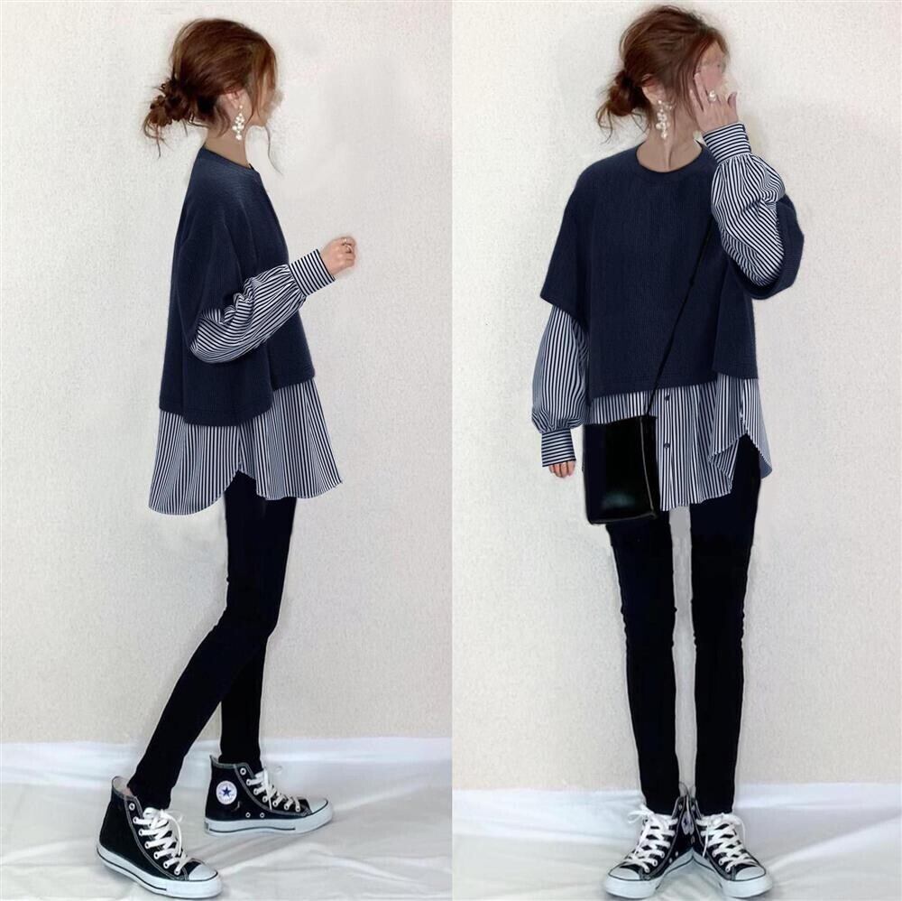 越境貿易これらの新しい秋と冬のラウンドネックニットステッチストライプシャツデザイン感覚ルーズフェイクツーピーストップ オータム 秋物 ウィンター 冬物 Oネック cat870507325951