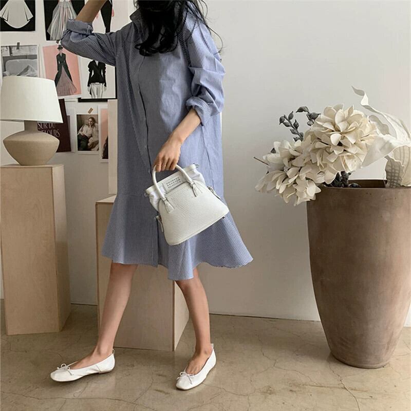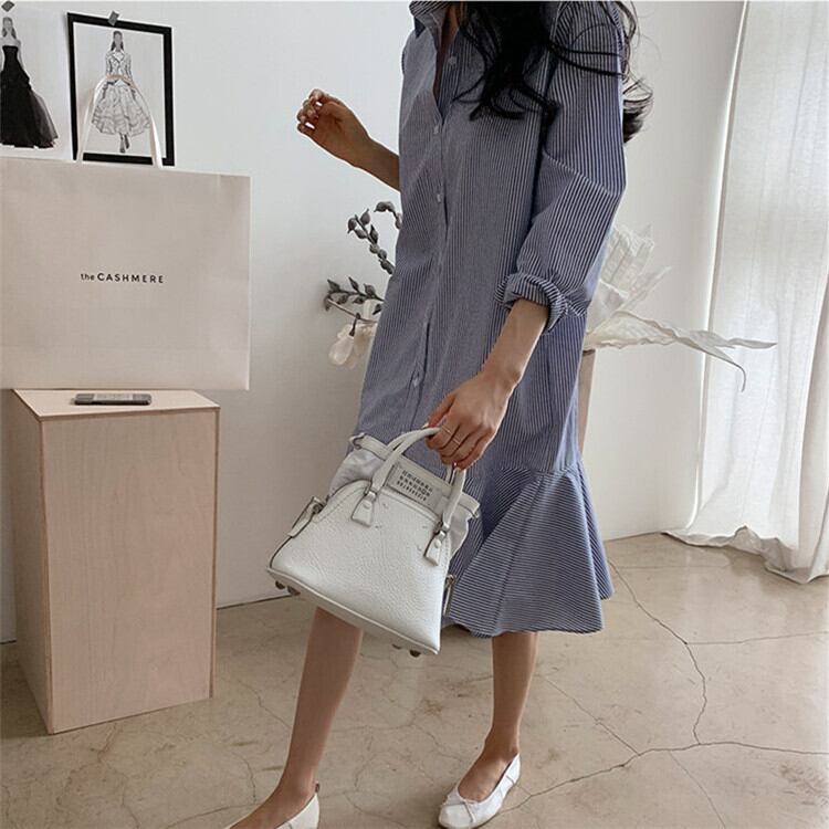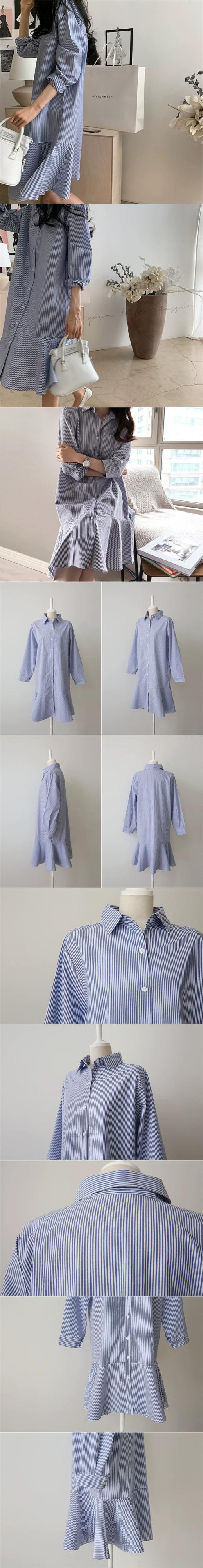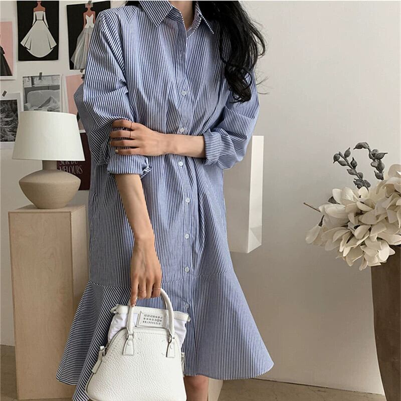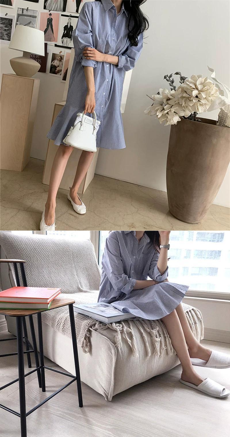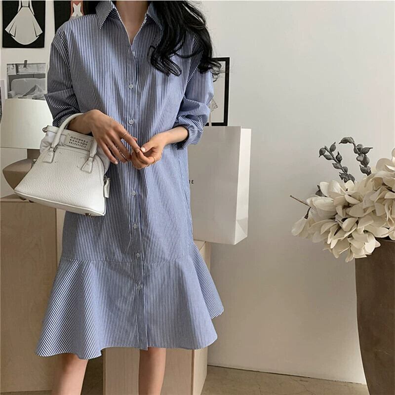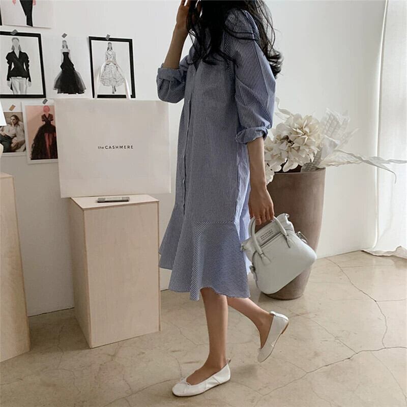 POLO 襟シングルブレストフリル 9 分袖ストレートスカート 2022 春夏ルーズピンストライプドレスマーメイドスカート スプリング 春物 サマー 夏物 cat875891223691