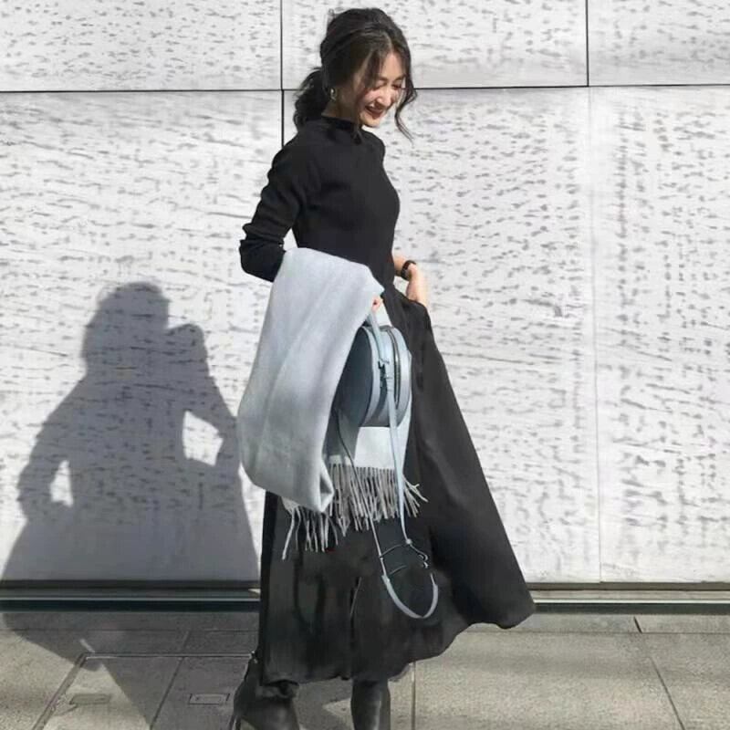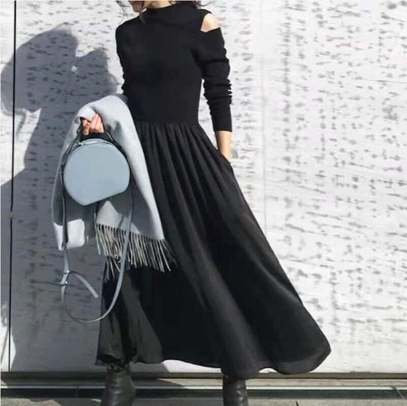 2021 秋の新と長袖オフショルダーニットステッチドレスラウンドネックハイウエスト黒の a ラインスカートロングスカート ハイウェスト ブラック オータム 秋物 Oネック Aライン cat894996361293