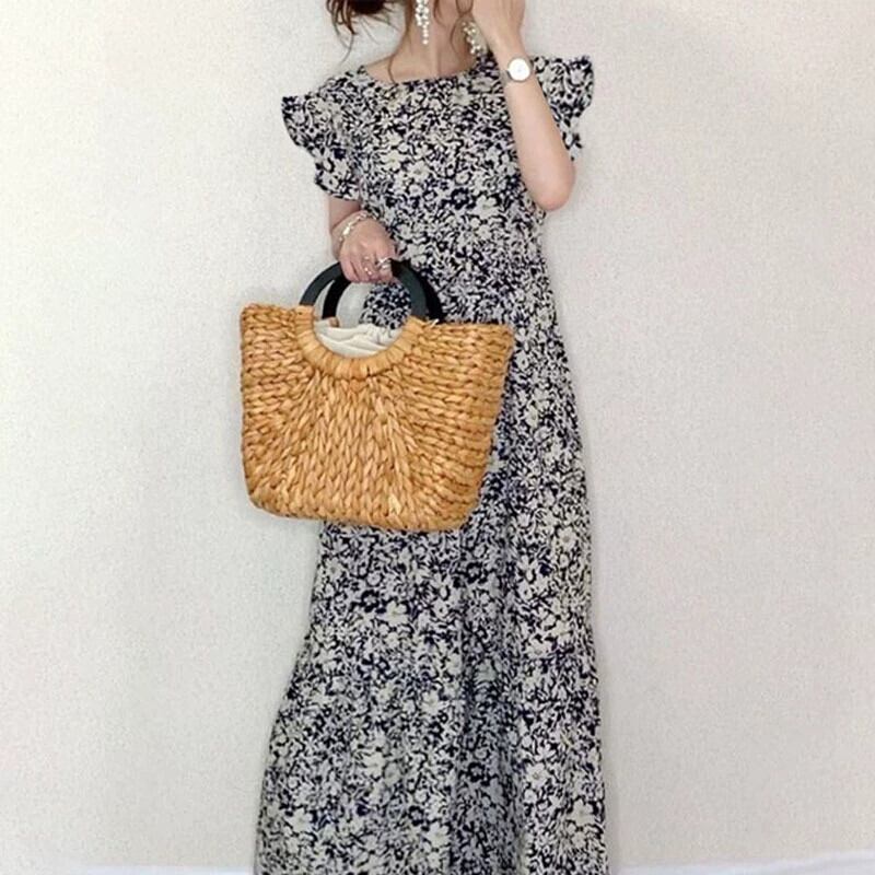 ese 女性の小花柄ドレス女性の夏の新しいラウンドネック蓮の葉スリーブ A ラインスカートスリムで薄いミドル丈スカート サマー 夏物 Oネック Aライン cat821322597658