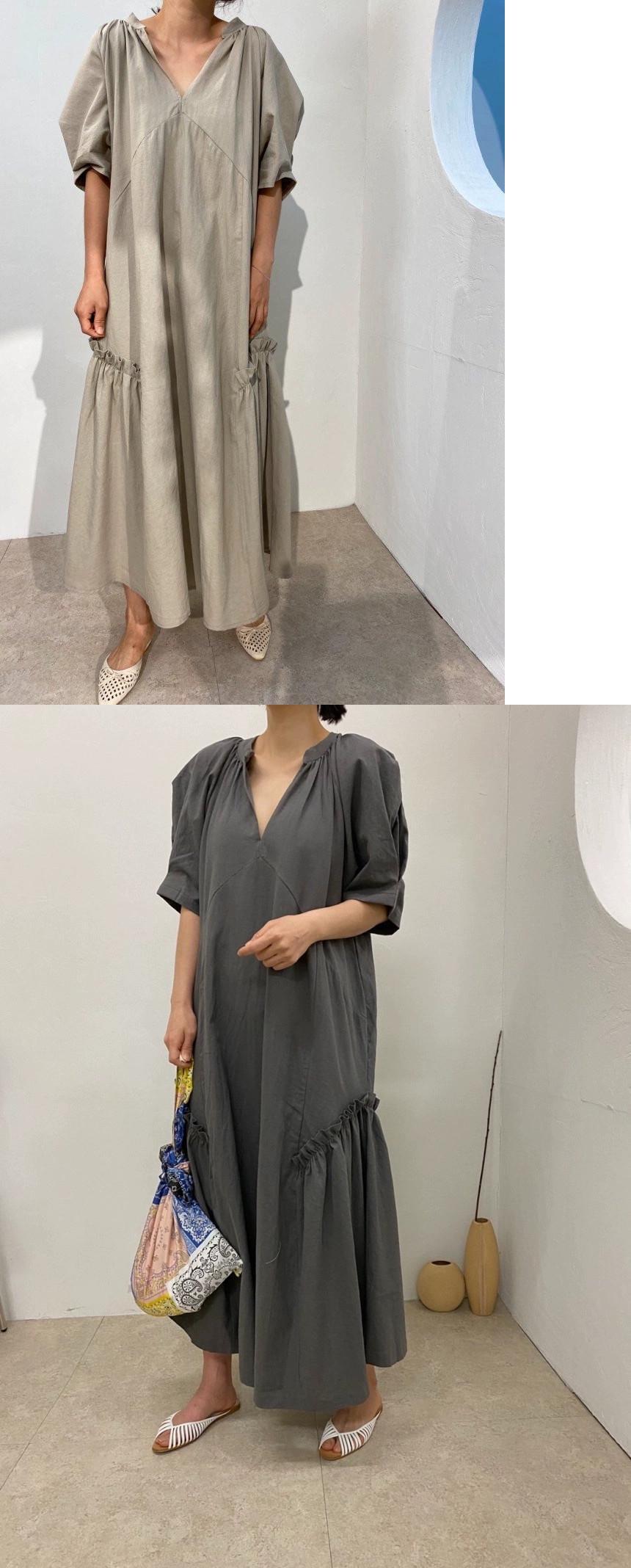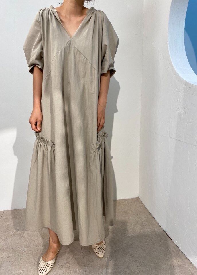 イン夏のバージョンのフランスの無地のレトロな気質Vネックパフスリーブ怠惰な風ルーズスリムロングドレス サマー 夏物 ソリッドカラー cat887200609976