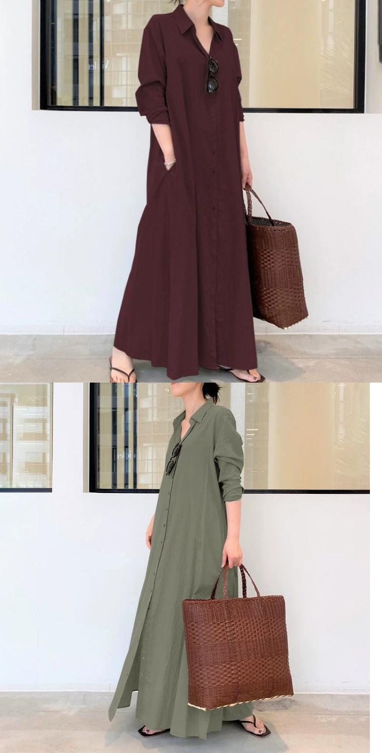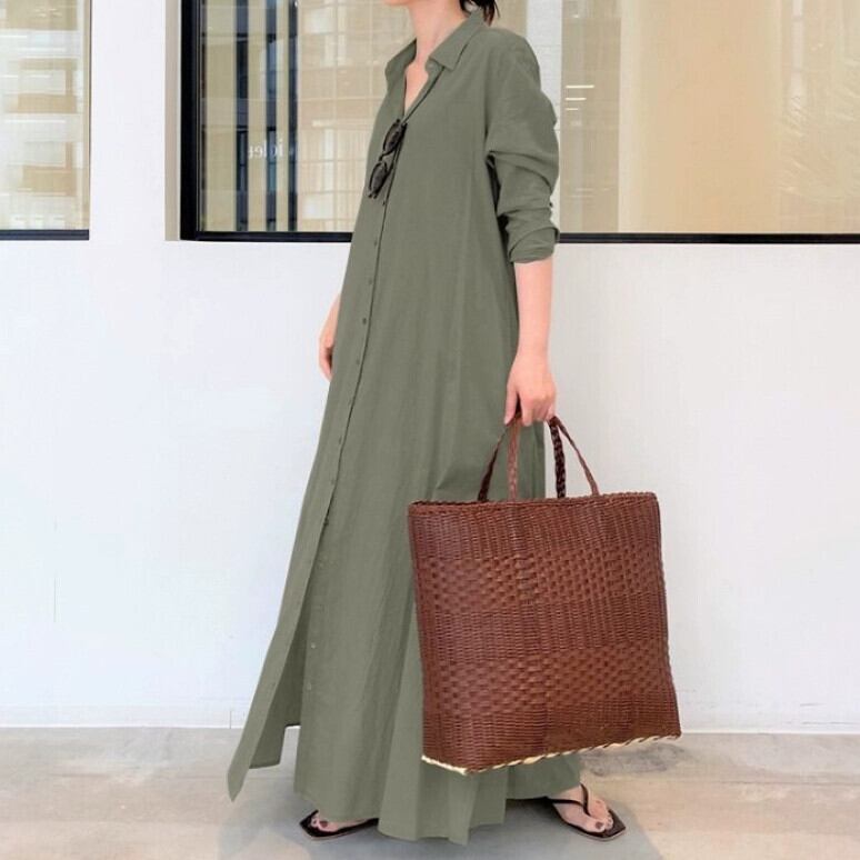 ese スタイル 2021 新ヨーロッパとアメリカンスタイルの無地ラペル長袖ポケットシンプルなルーズカジュアルロングシャツドレス ソリッドカラー ヨーロピアン cat833303623516