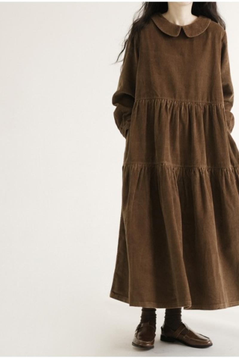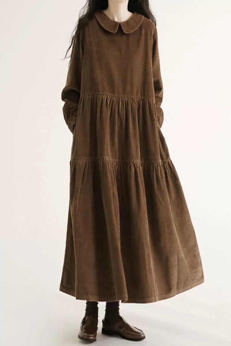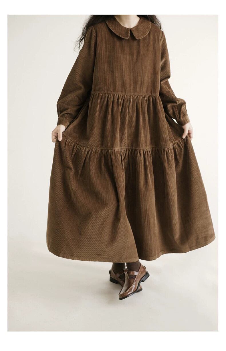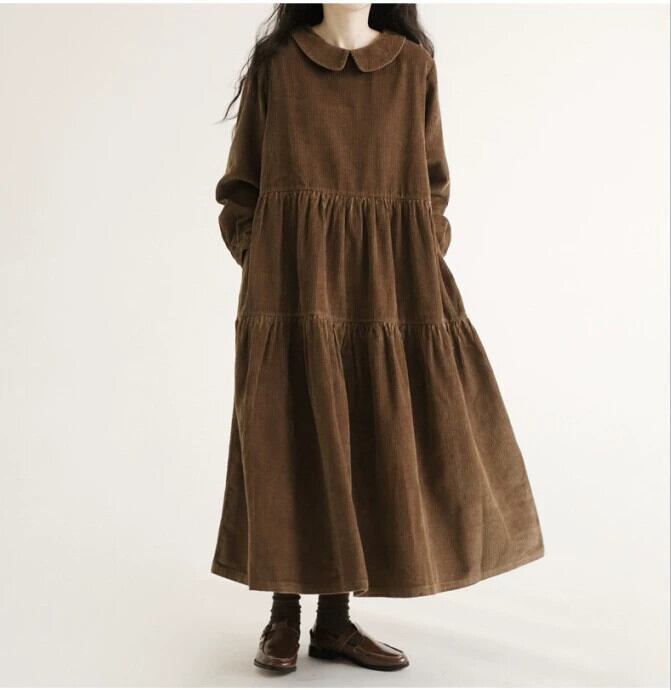 コーデュロイバージョンの人形襟長袖ドレス秋冬新作ゆったり大きいサイズシンプルAラインスカートロングスカート 大きめサイズ オータム 秋物 ウィンター 冬物 cat893657268943