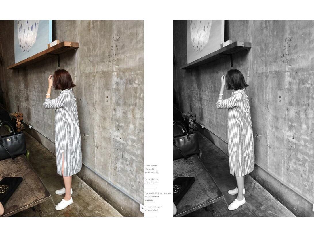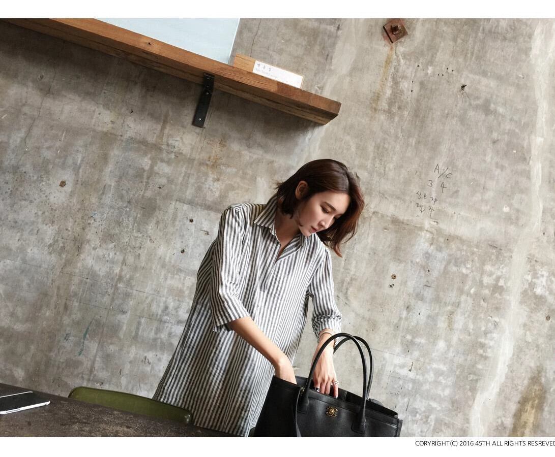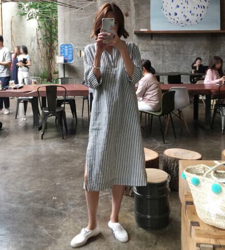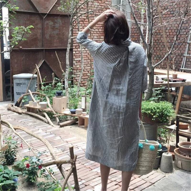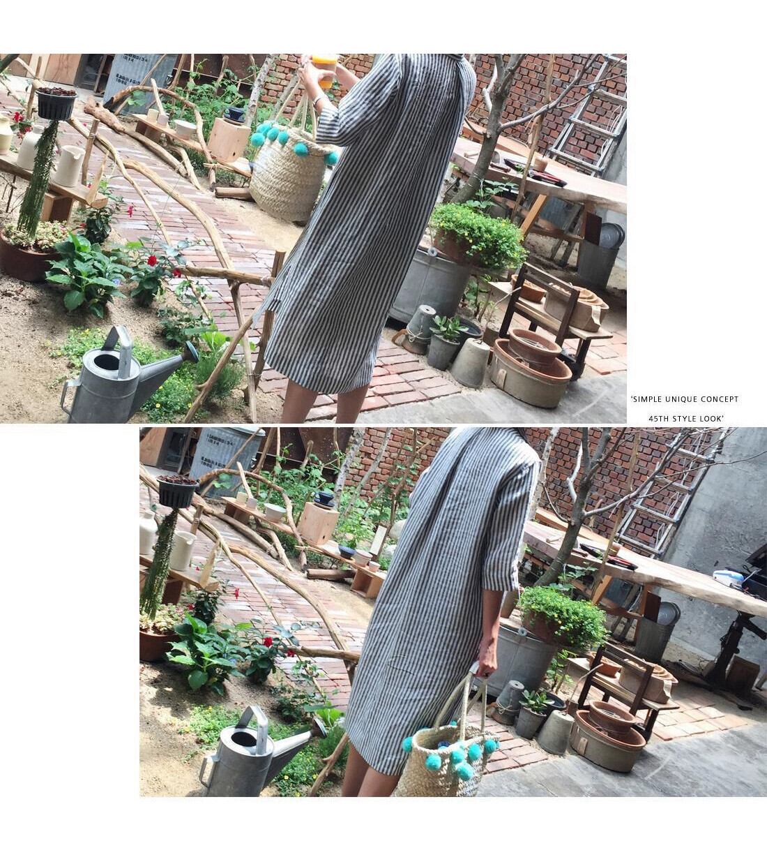 バージョンルーズ大きいサイズポロ襟レトロストライプ綿とリネンのシャツドレス七分袖怠惰な風ミッドレングススカート女性 コットン 大きめサイズ cat823491330784
