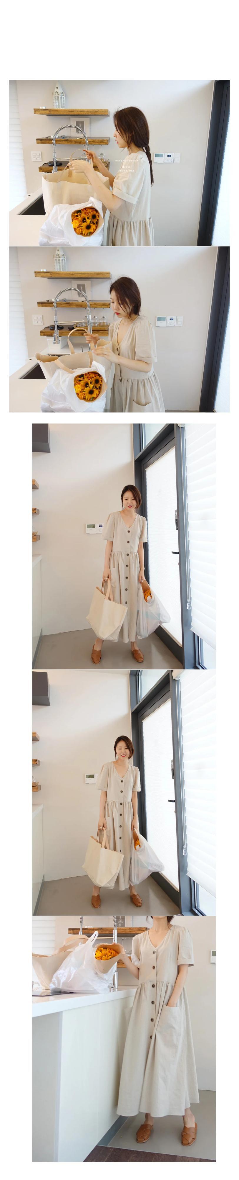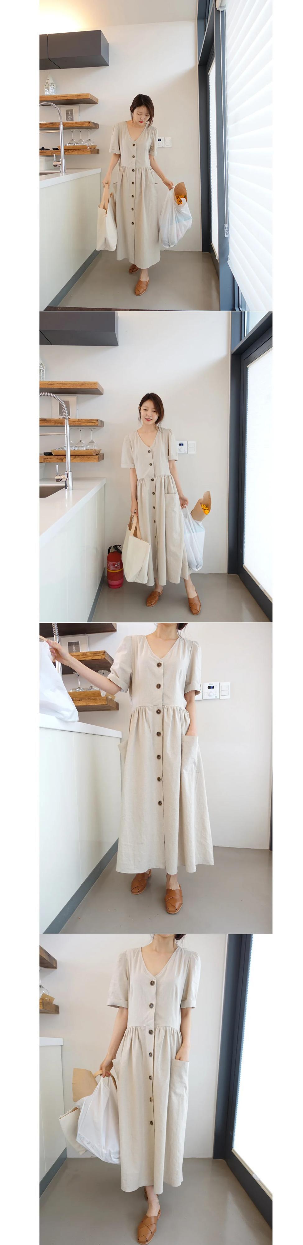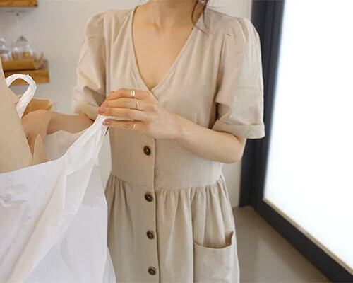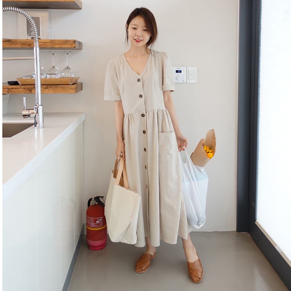シックで新しいレトロなシングルブレスト、シンプルな無地、オールマッチ、Vネック、ポケット、膝上丈のコットンとリネンのドレス。 ソリッドカラー cat819441001778