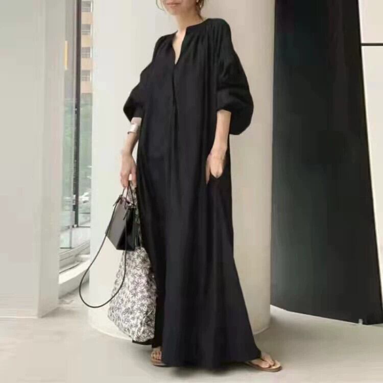ese eign trade 新しいスタンドアップカラー無地レトロダークロングルーズ大きいサイズファッションカジュアルランタンスリーブドレス 大きめサイズ ソリッドカラー cat823421212721
