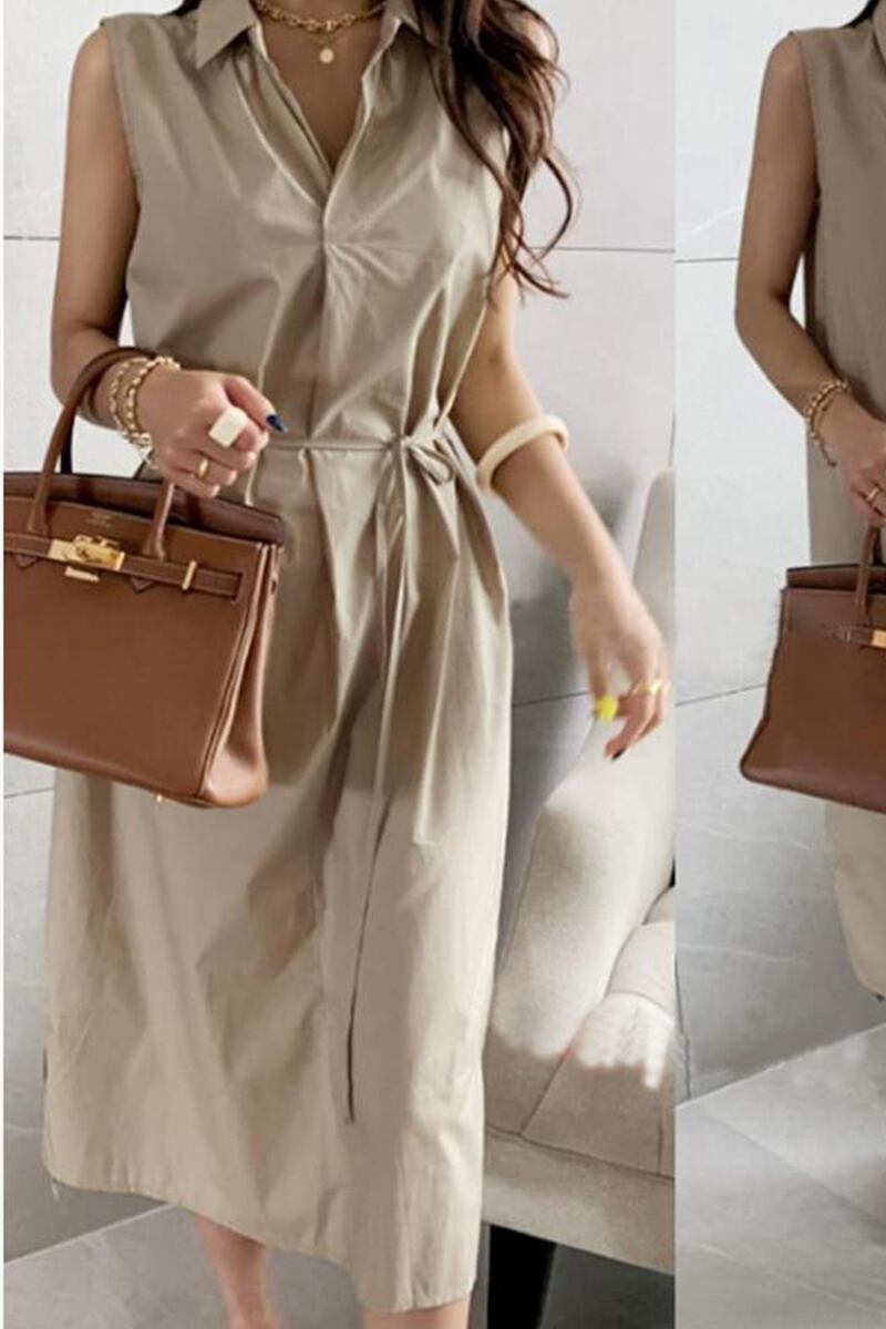 シックで優しいスタイルの無地ポロカラーノースリーブシャツドレスウエストストラップミドル丈膝上ドレス夏 サマー 夏物 ソリッドカラー cat843455145786