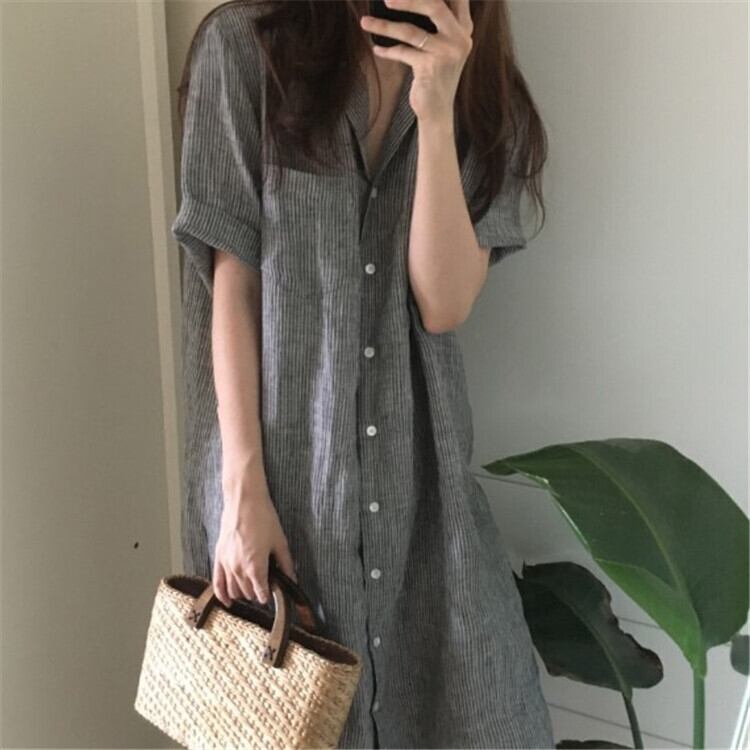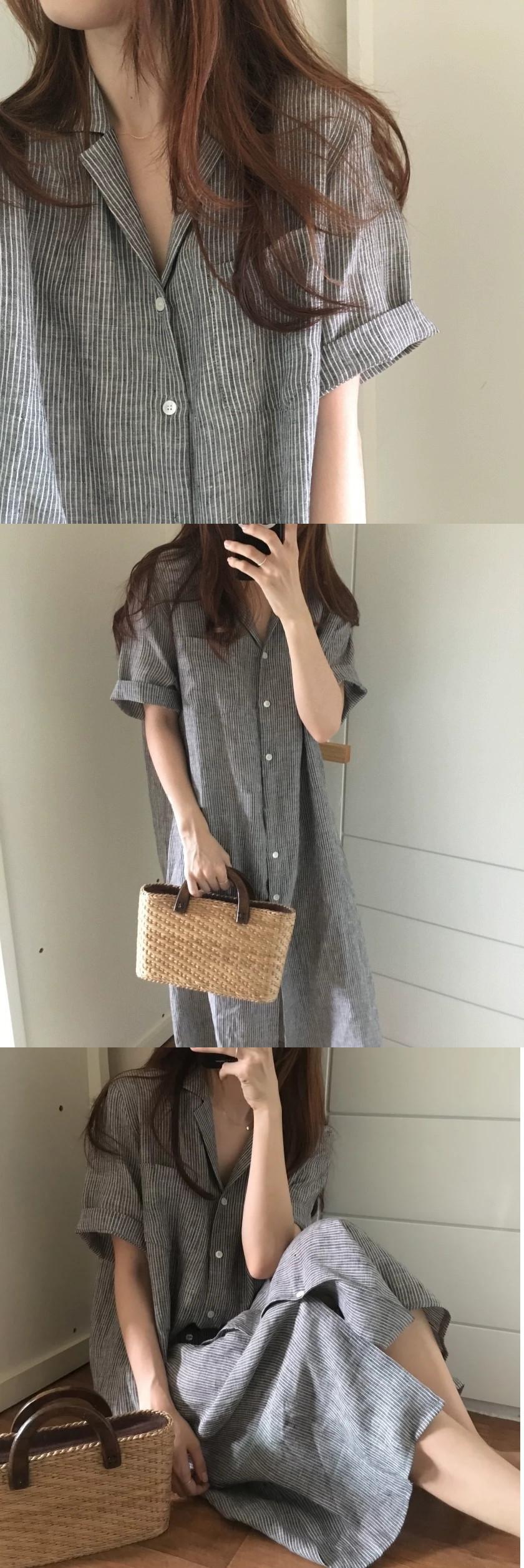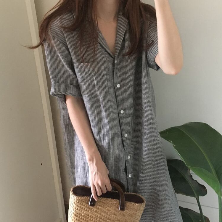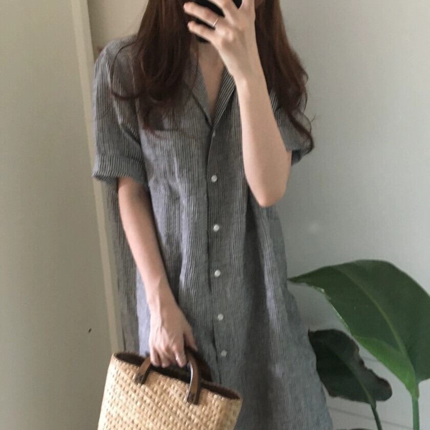 インコールドウィンドストライプ半袖シャツレディース夏膝上ルーズラペルミドル丈ドレスシャツスカートのバージョン サマー 夏物 cat899038423700