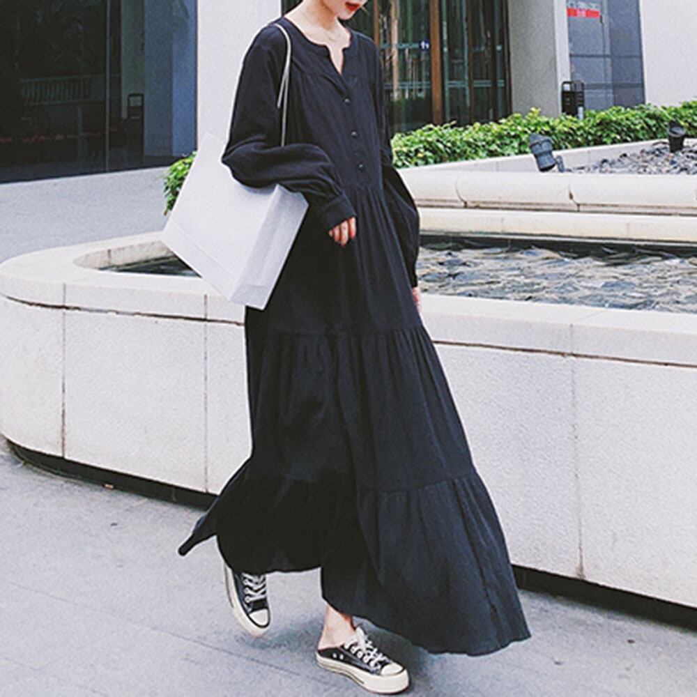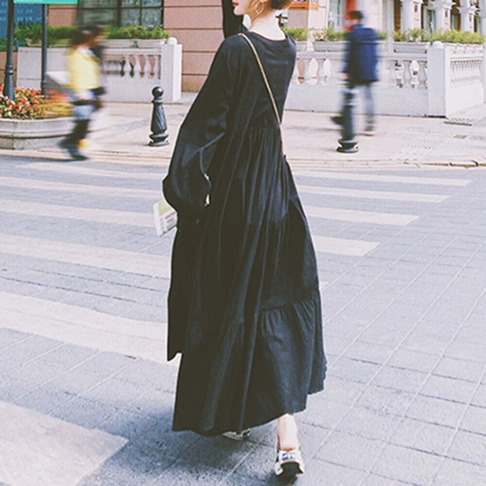 ese and style ins 女性のストリートスイングドレス春と夏のリトルブラックドレスレトロランタン長袖ヘボンスタイルドレス ロング スプリング 春物 サマー 夏物 cat819019780895