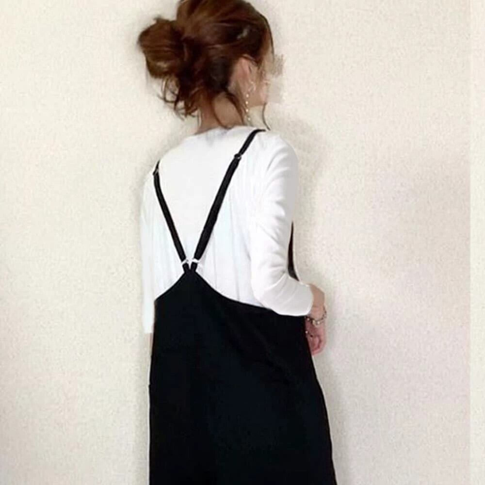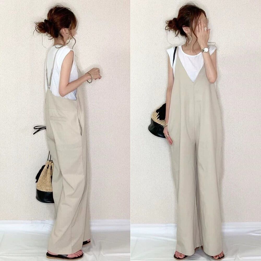 越境 ese 春と夏の新しいレトロシンプルな黒の緩くて薄い気質 V ネックサスペンダージャンプスーツワイドレッグパンツ ブラック スプリング 春物 サマー 夏物 Vネック cat898741914358