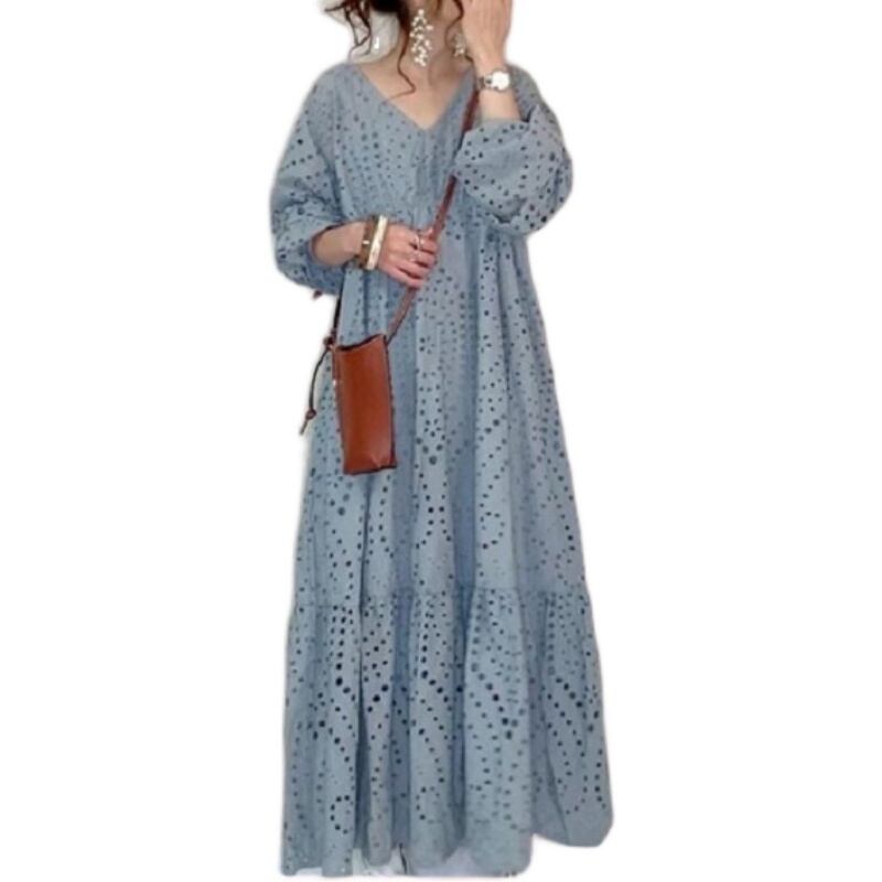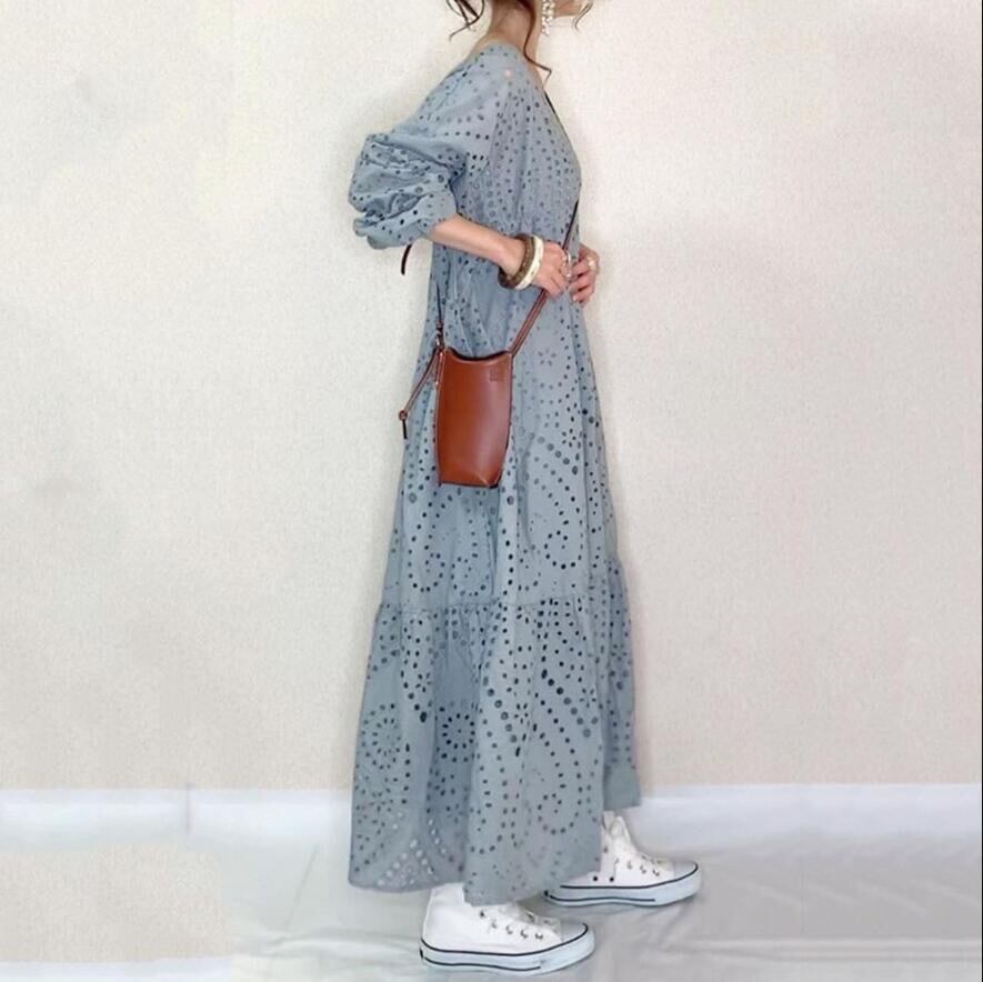 ese森ガール 2022 春スタイル 中空かぎ針編みレース パレス パフスリーブ Vネック ルーズドレス ロング 大人ガーリー スウィート キュート カジュアル スプリング 春物 cat882599983972