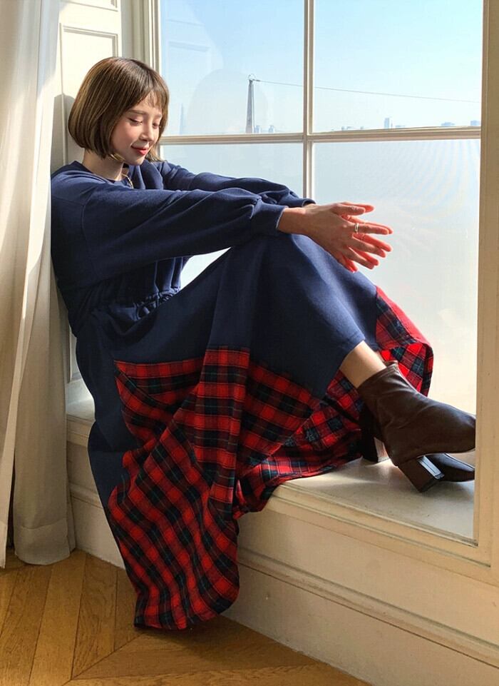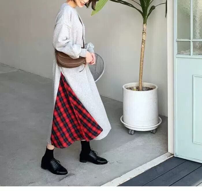 eign trade バージョン緩い大きいサイズ巾着ウエストプラスフリースセータードレス秋と冬のカジュアル個性カラーマッチングロングスカート女性 大きめサイズ オータム 秋物 ウィンター 冬物 cat884241210852