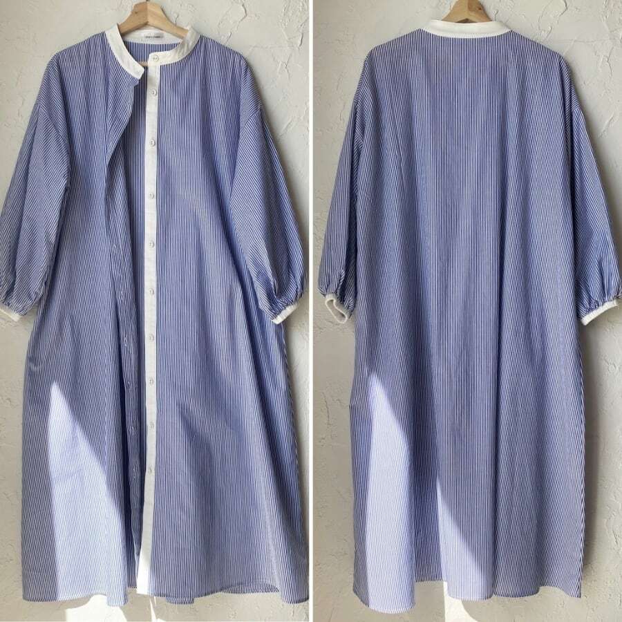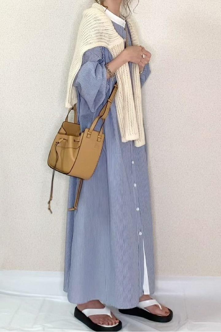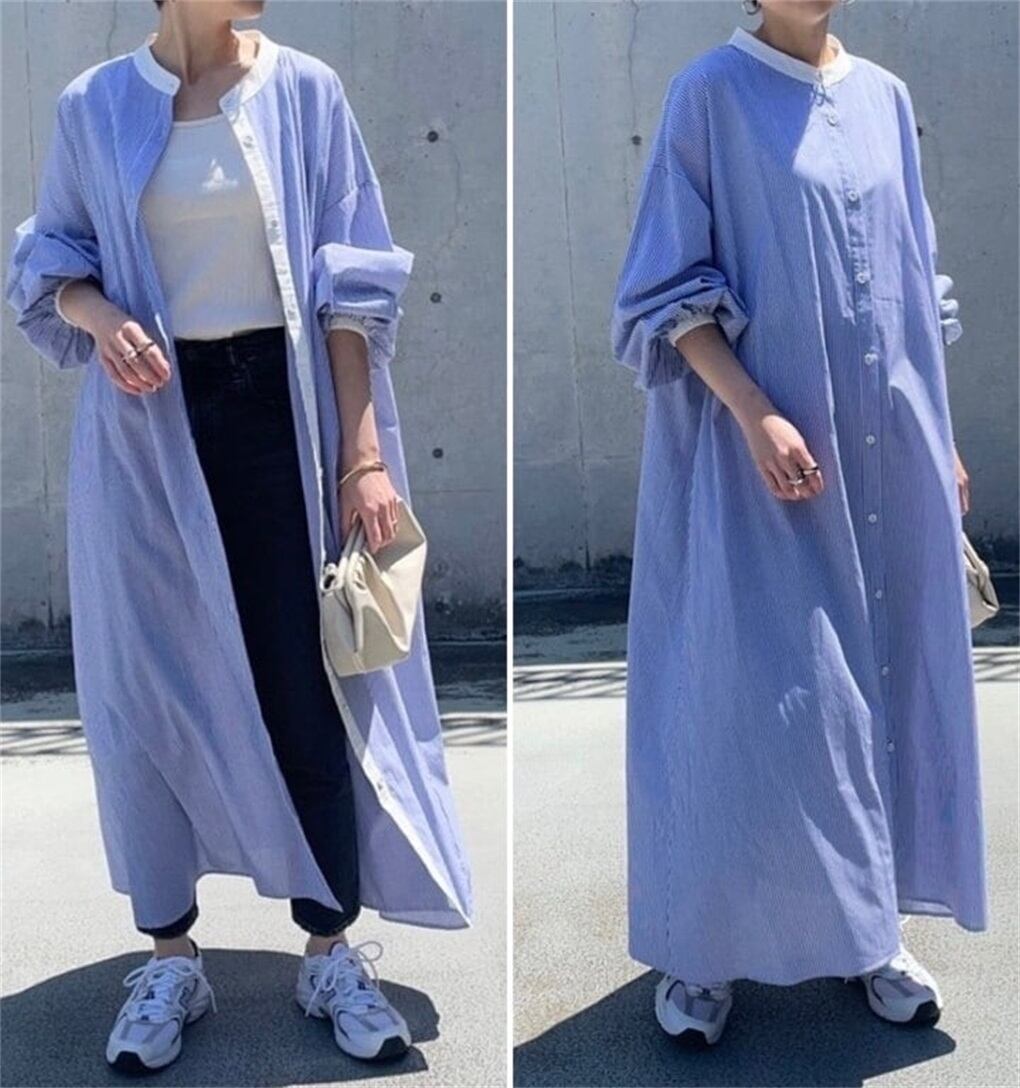越境 ese スタイル 2022 春夏婦人服新しい緩い大きいサイズ青と白のストライプのミドル丈シャツカーディガンドレス ホワイト ブルー 大きめサイズ スプリング 春物 サマー 夏物 cat883005737263
