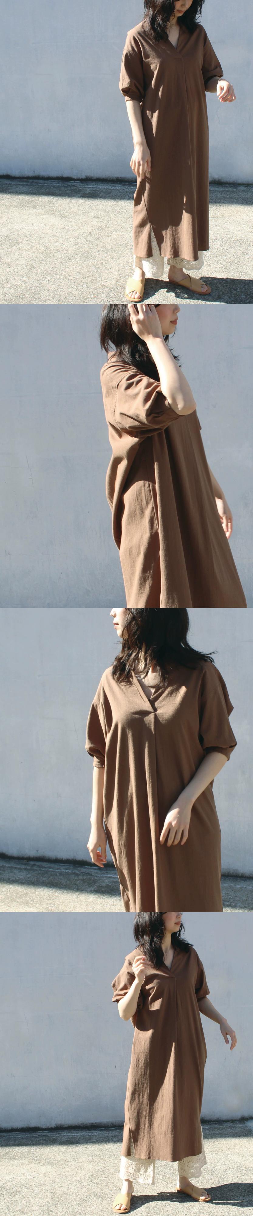 クロスボーダーゆったり大きいサイズシャツワンピースロング膝丈ワンピース半袖Vネック綿麻スリットカジュアルロングスカート コットン 大きめサイズ cat88856943055
