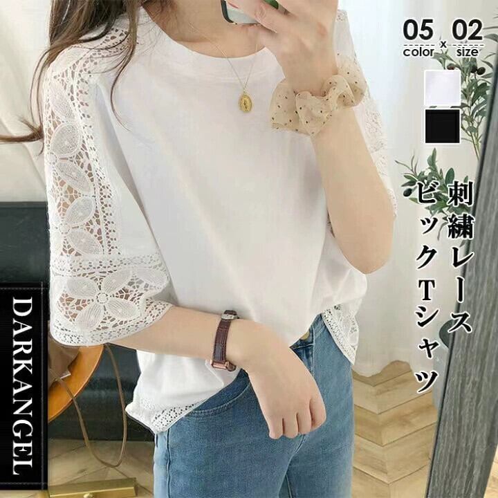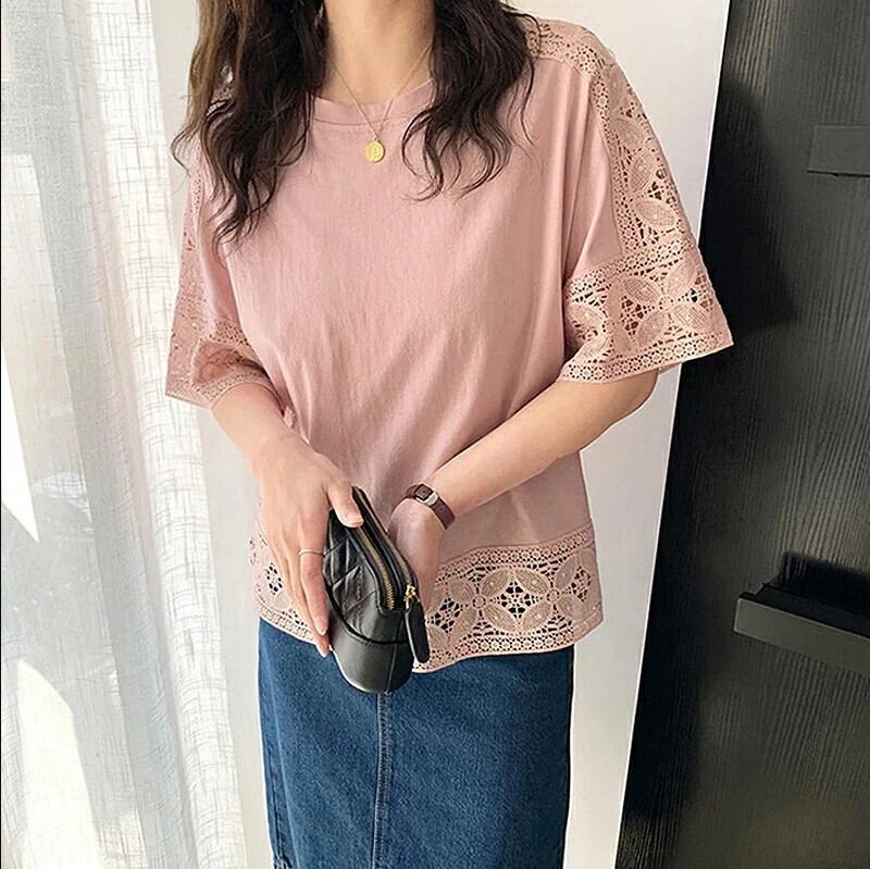 越境 ese と絶妙なラウンドネック 5 分袖ニットバットシャツ 2022 夏の新しい中空レースステッチ T シャツ サマー 夏物 Oネック Tシャツ cat813263116665