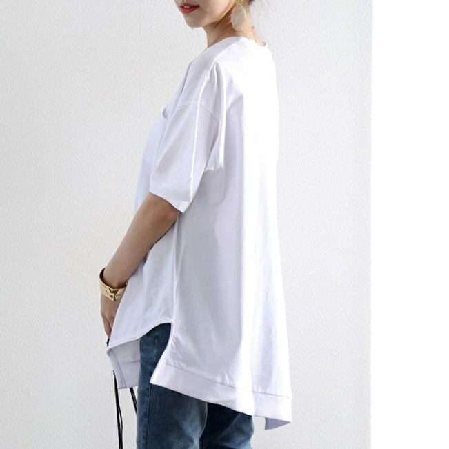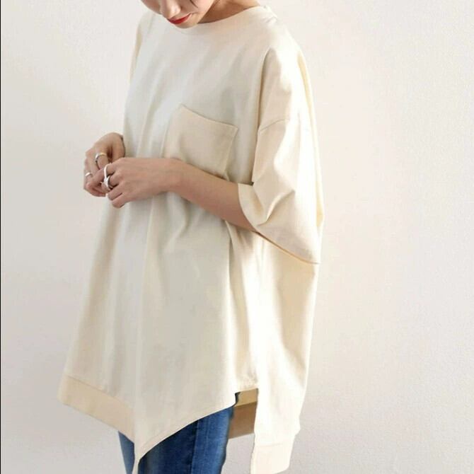 越境貿易2022、夏の新作不規則でゆったりとした大きいサイズのパッチポケットミドル丈Tシャツラウンドネックトップ 大きめサイズ サマー 夏物 Oネック cat861237300426