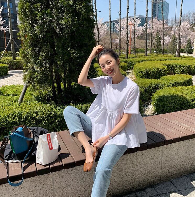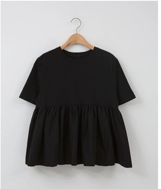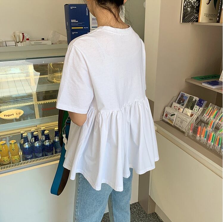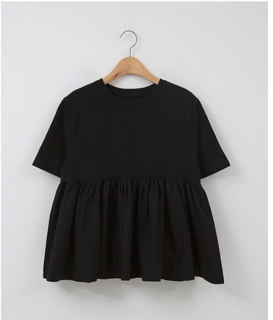 バージョンの純色ドールシャツ女性の夏の純綿ラウンドネックプルオーバー半袖a字型スプライシングルーズパフシャツトップ コットン サマー 夏物 Oネック ピュア cat811760528430