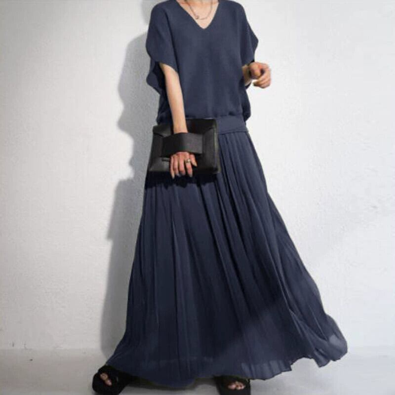 eign trade アマゾンスタイル 2022 春と秋のクロスボーダー ese スタイル V ネックニットステッチプリーツロングスカートビッグスイングドレス スプリング 春物 オータム 秋物 Vネック cat811541006258