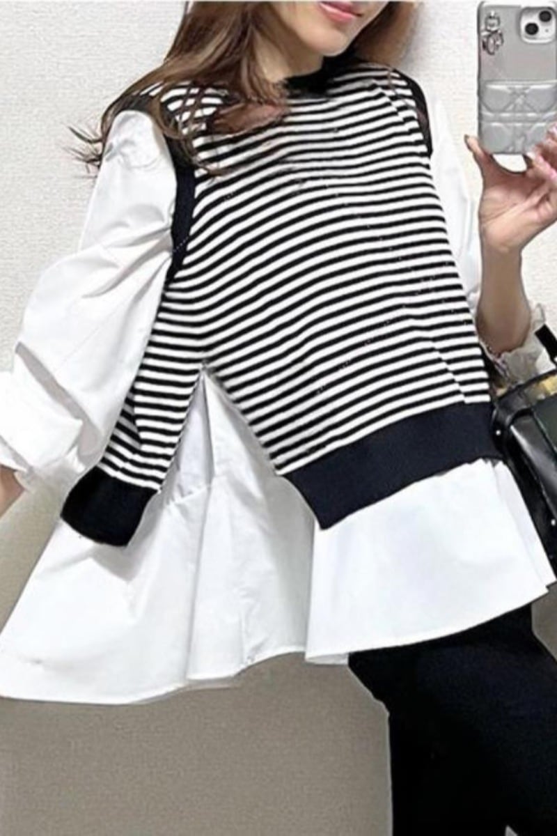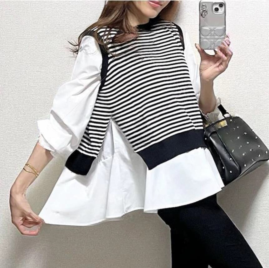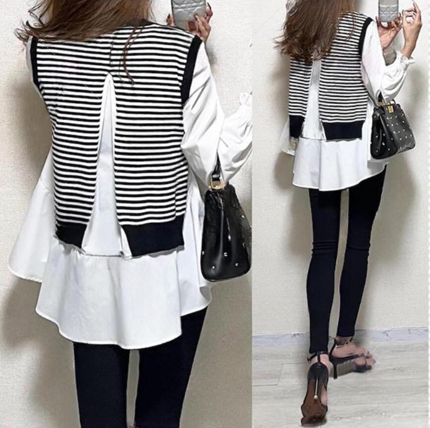 クロスボーダー ese ストライプ ステッチ フェイク ツーピース ドール シャツ レディース ルーズ カジュアル デザイン センス オールマッチ スイート シャツ 大人ガーリー スウィート キュート cat873567976698