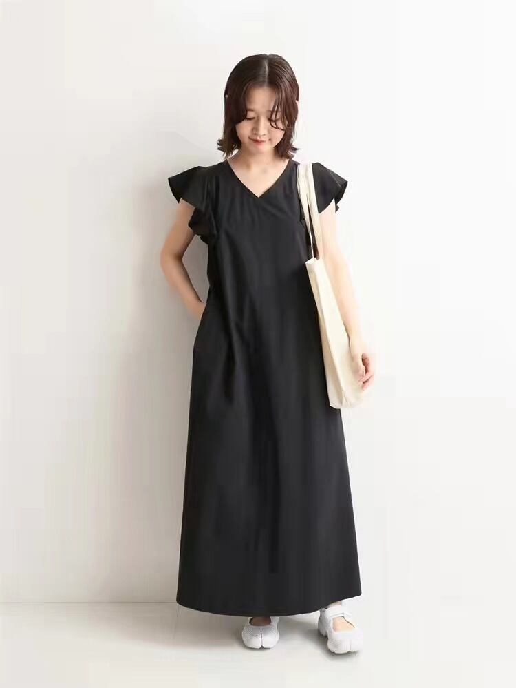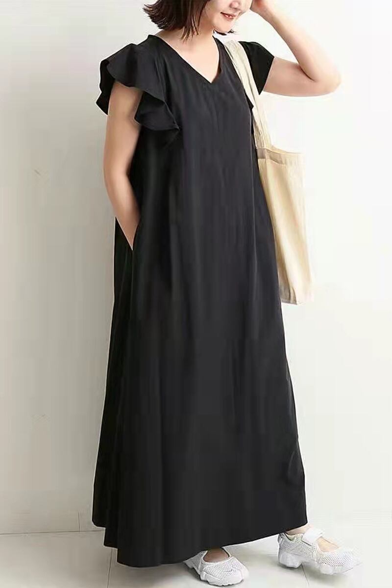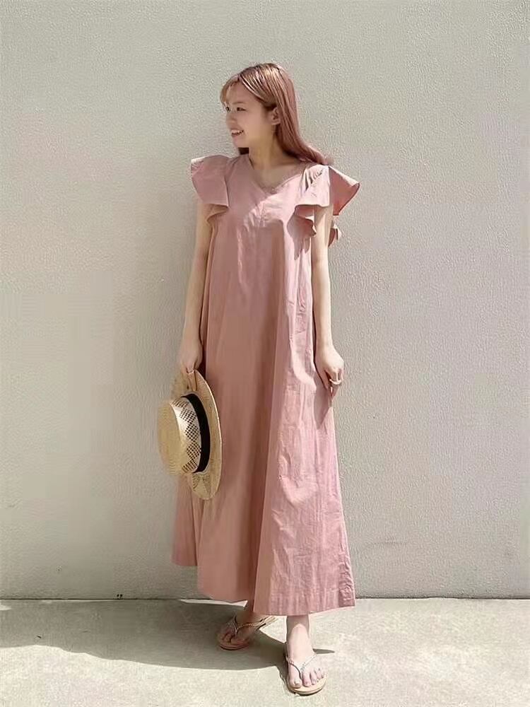 クロスボーダーエーゼアンドスタイルサマースタイルVネックフライングスリーブルーズで薄いシンプルな気質無地膝丈ロングドレス 夏物 ソリッドカラー cat811548080365