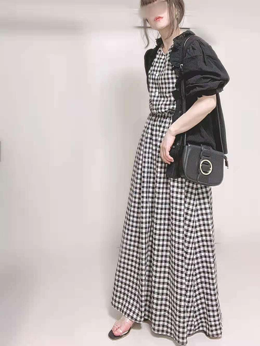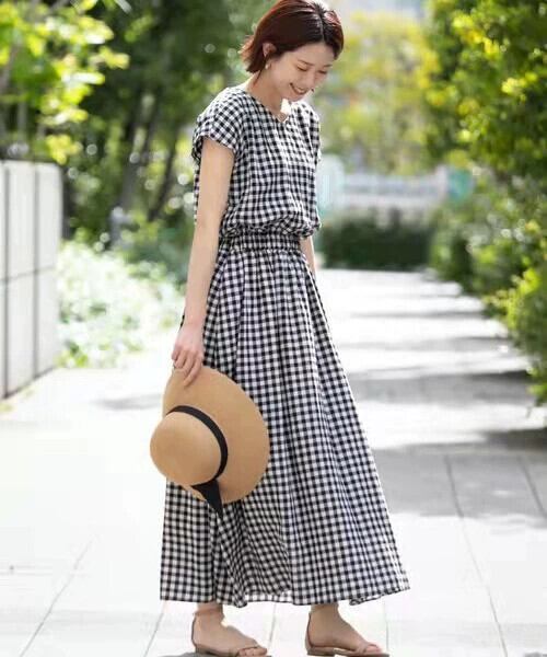 クロスボーダー ese とスタイルの前後 2 着弾性ウエストチェック柄ドレス女性の夏の新しい半袖スリム気質ロングスカート エラスティック 伸縮 サマー 夏物 cat877111099484