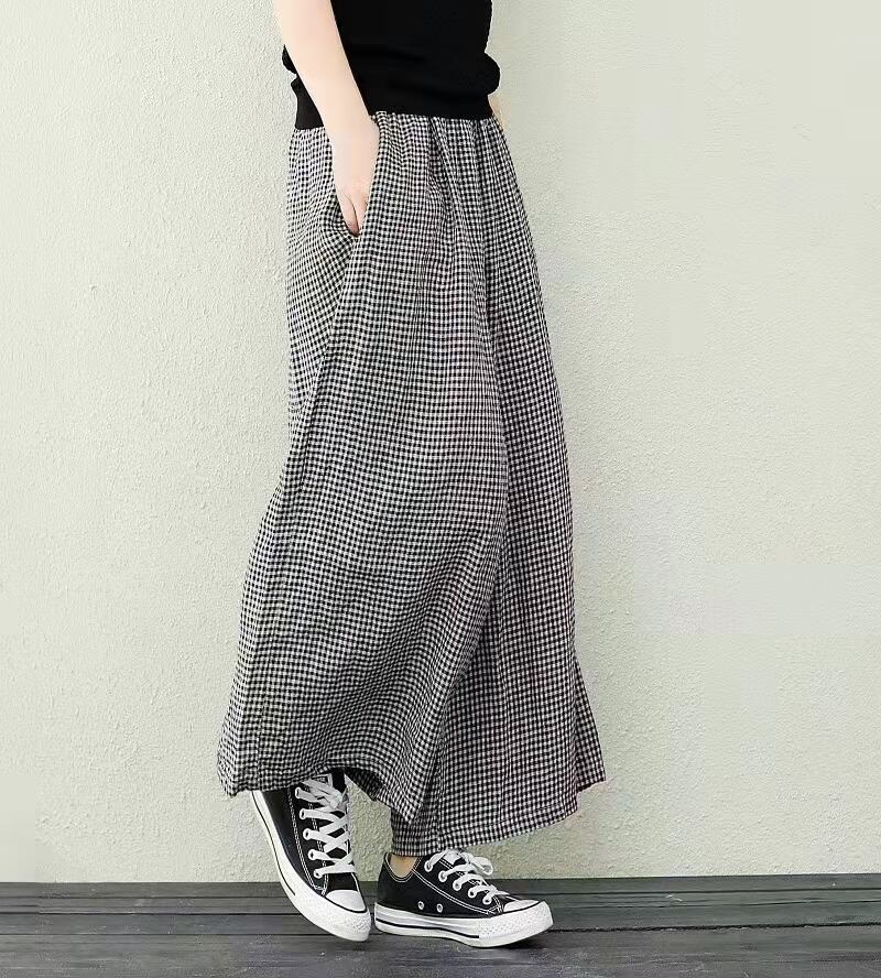 越境 ese と 2022 夏の新しい弾性ウエスト緩くて薄い大きいサイズ文学レトロチェック柄ワイドレッグパンツカジュアルパンツ エラスティック 伸縮 大きめサイズ サマー 夏物 cat892581243311