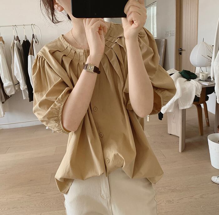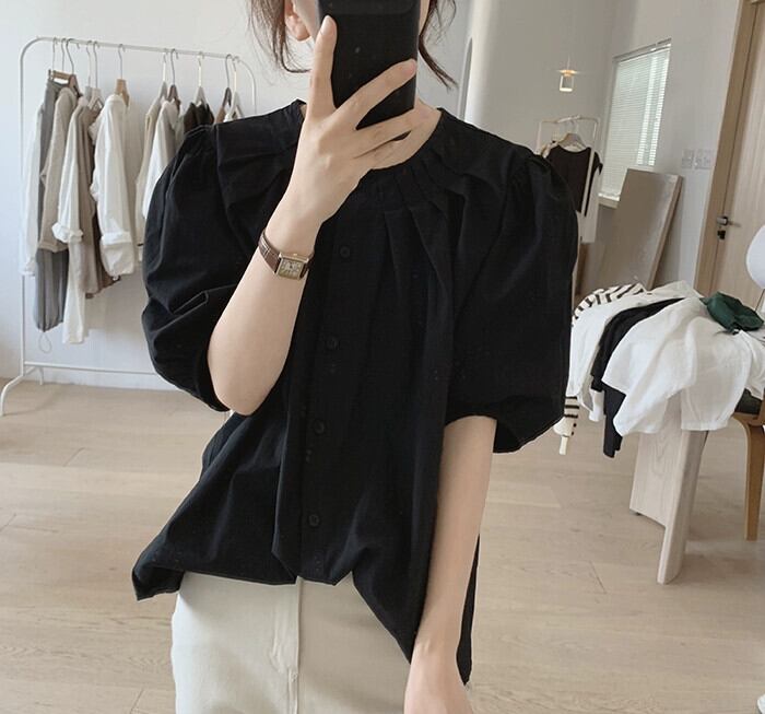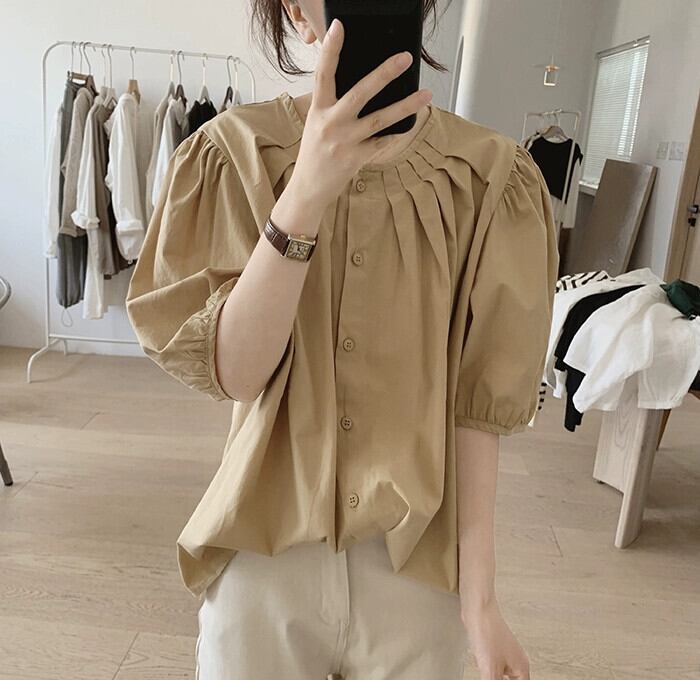 パフスリーブシャツレディース夏の新作ゆったり薄手プリーツラウンドネックニッチデザインコットン半袖トップ サマー 夏物 Oネック cat829918769799